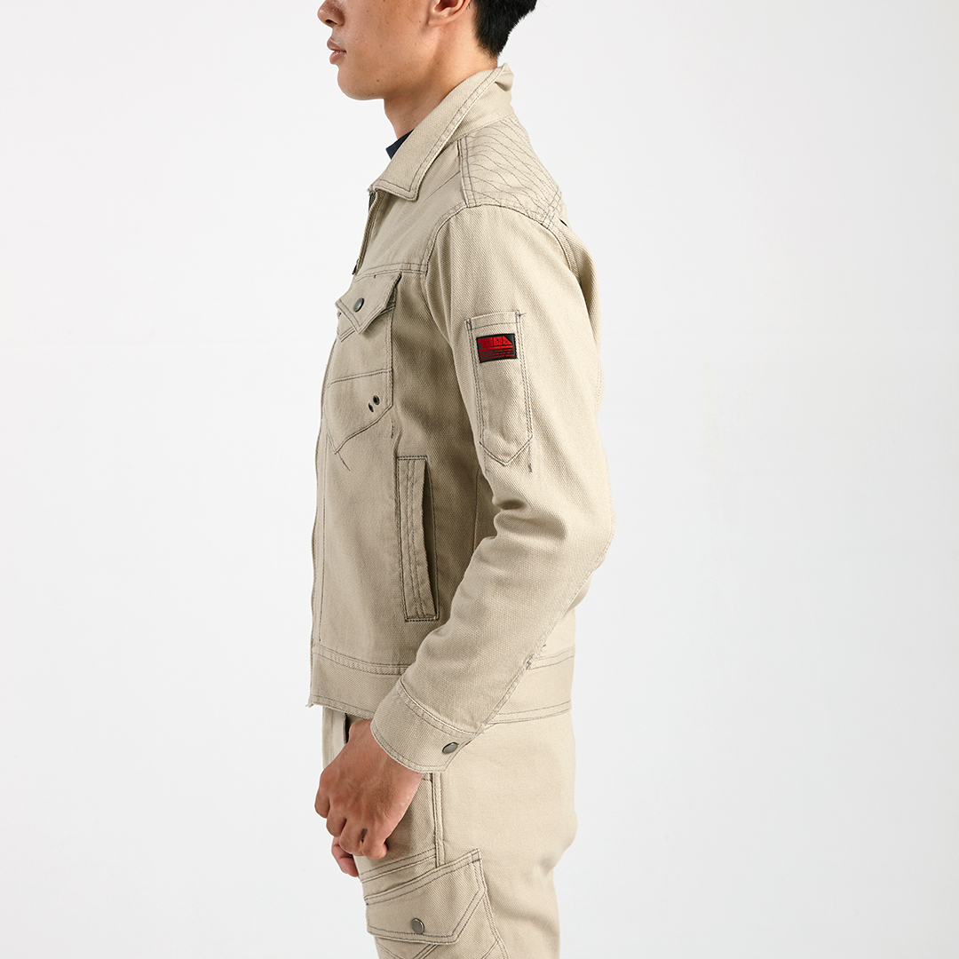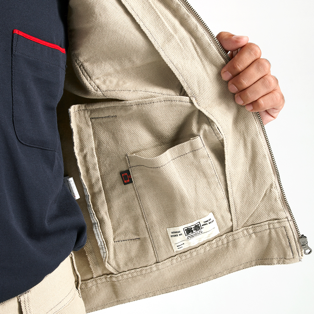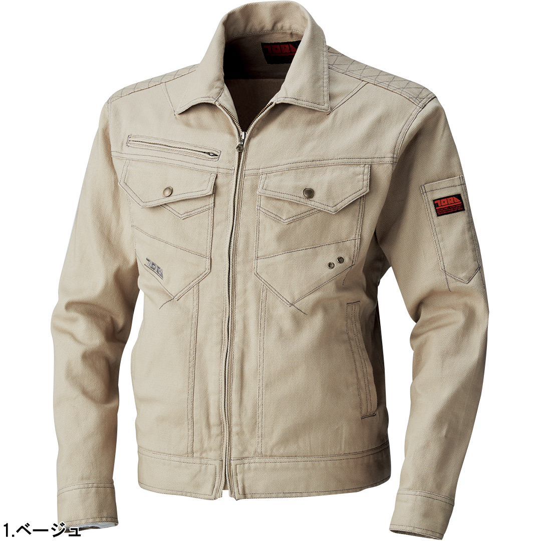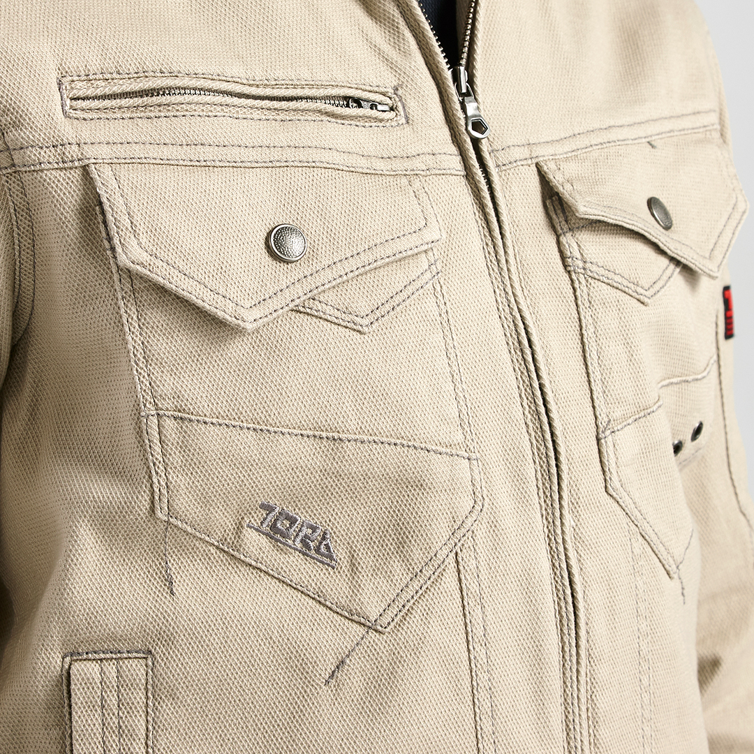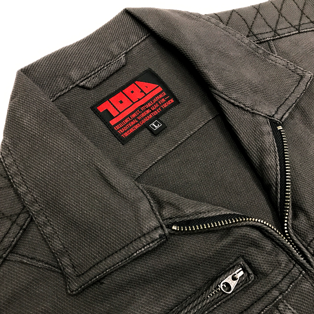 ポリウレタン2%を混紡した肉厚のストレッチ入り綿素材で柔らかい着心地のブルゾンです。背中にはノーフォークを採用。肩や腕がスムーズに動かせるよう工夫されています。肩部分には刺子調の補強ステッチを施し、耐久性にも配慮しました。内ポケットは必要に応じて小物など収納していただけます。独特な切り替えのポケットや左袖の赤色ブランドネーム、右胸ポケットのTORA刺繍などディテールにもこだわった逸品です。