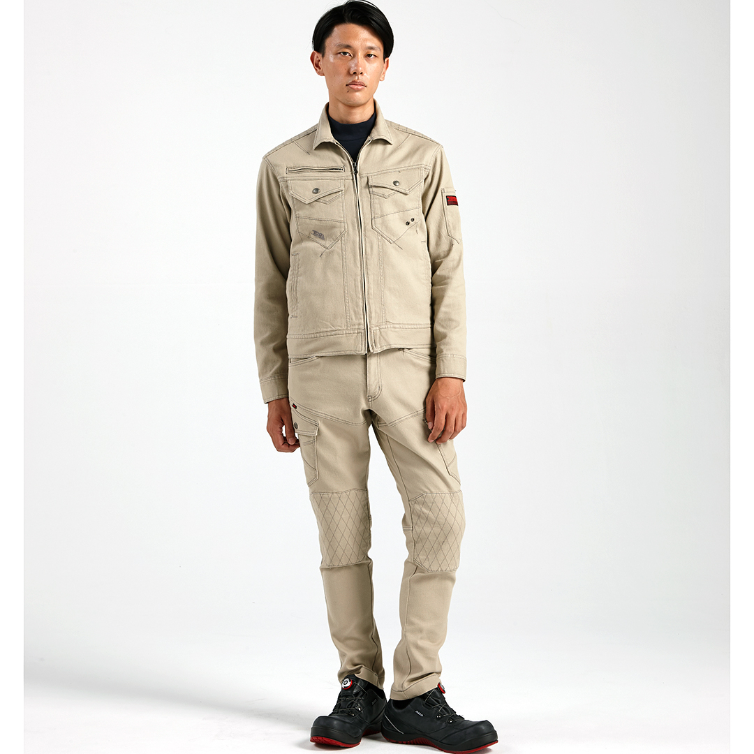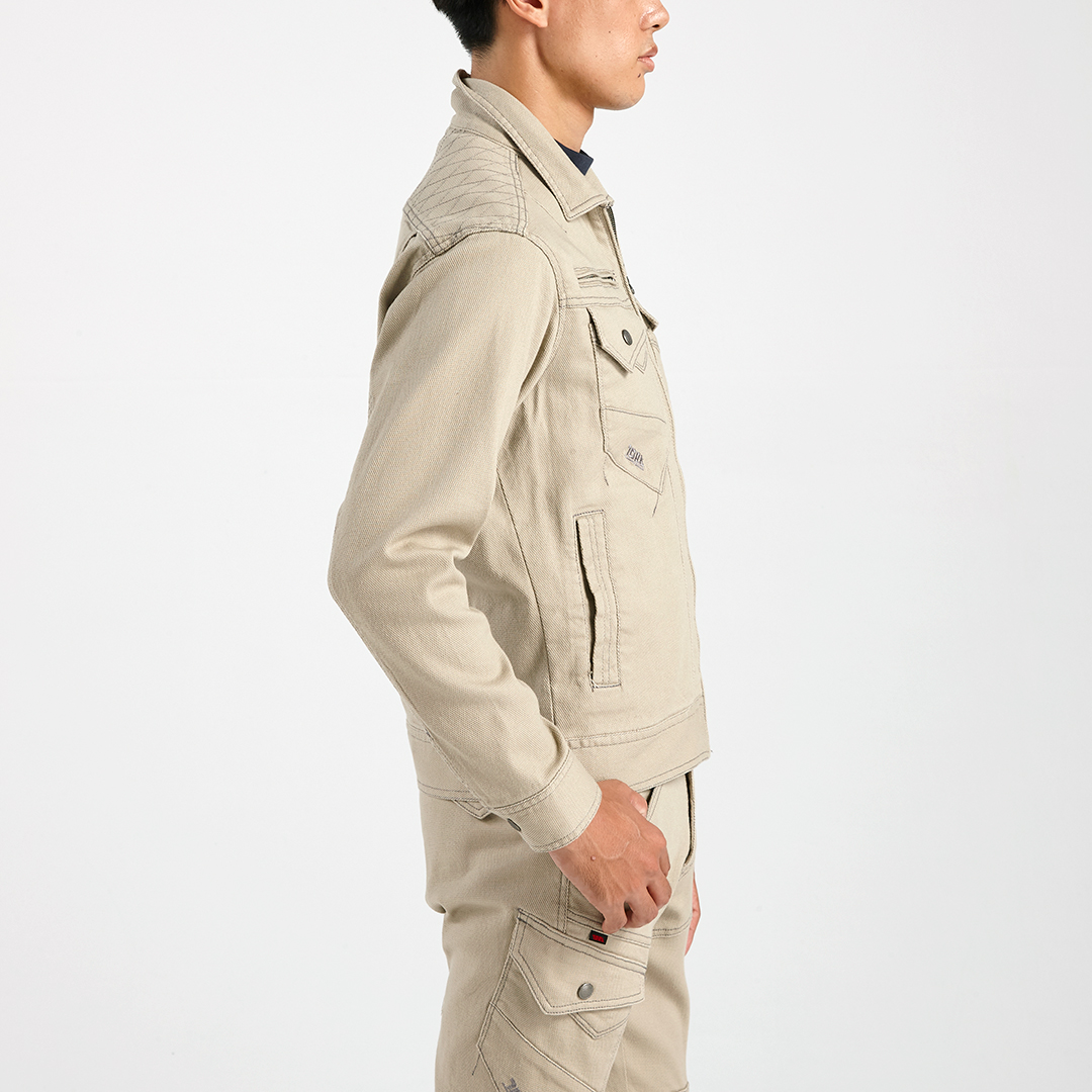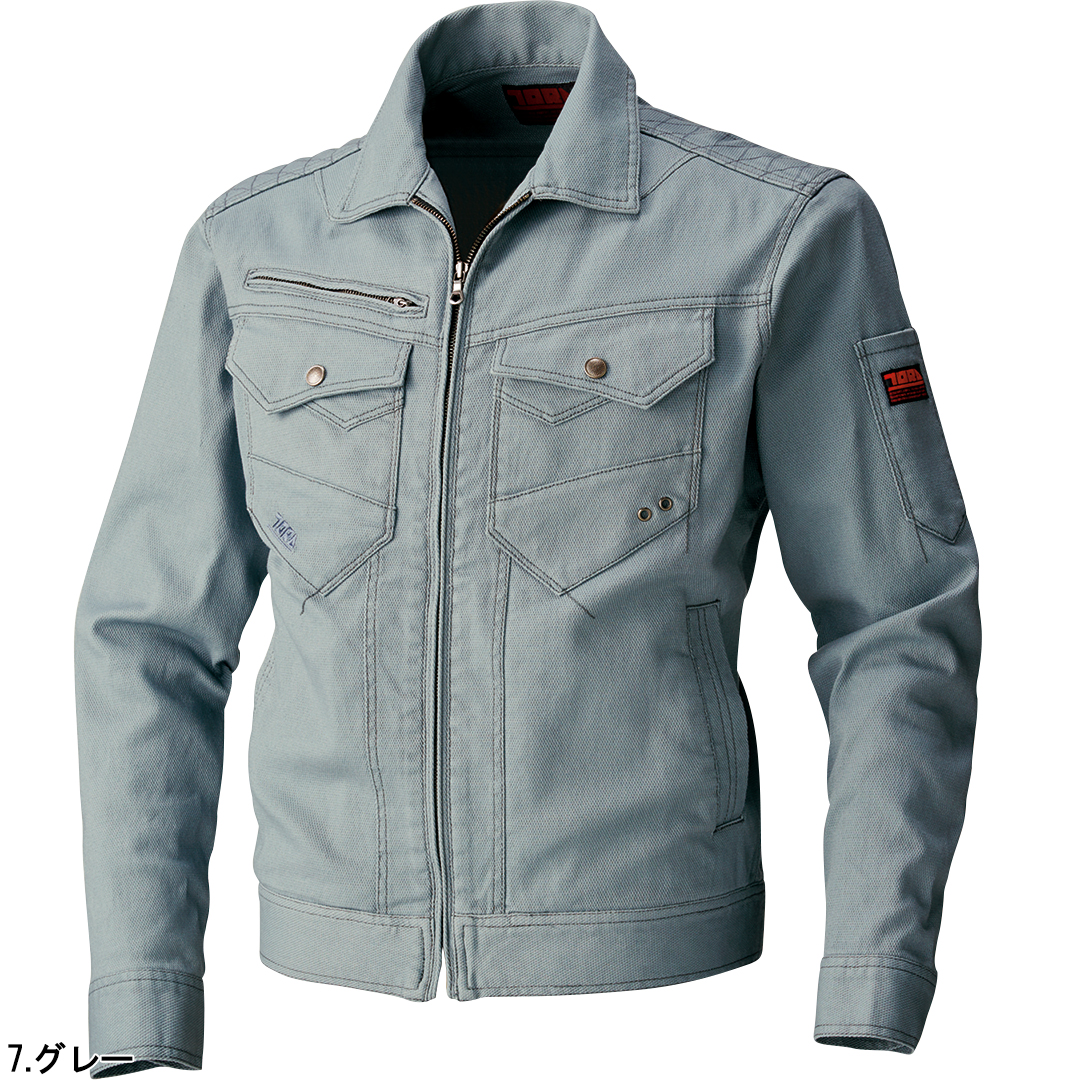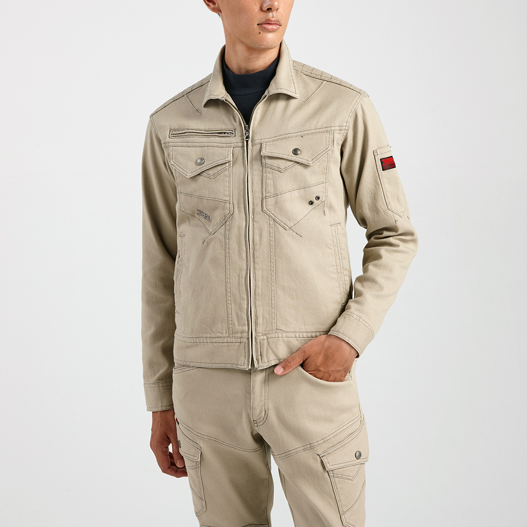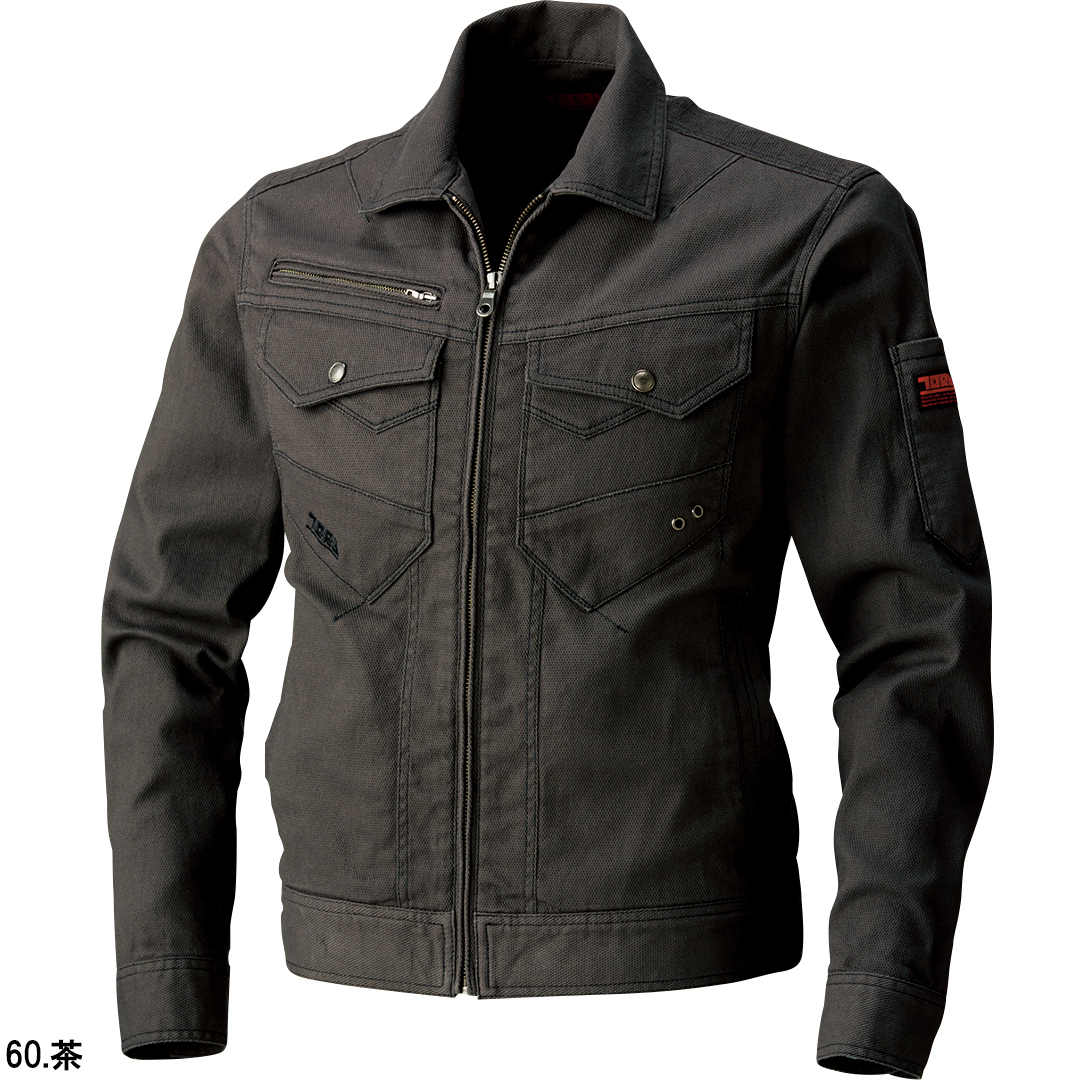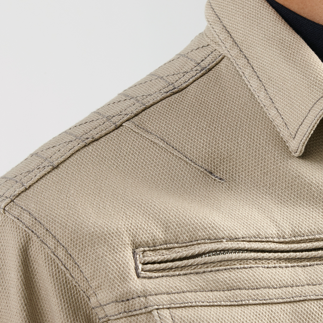 ポリウレタン2%を混紡した肉厚のストレッチ入り綿素材で柔らかい着心地のブルゾンです。背中にはノーフォークを採用。肩や腕がスムーズに動かせるよう工夫されています。肩部分には刺子調の補強ステッチを施し、耐久性にも配慮しました。内ポケットは必要に応じて小物など収納していただけます。独特な切り替えのポケットや左袖の赤色ブランドネーム、右胸ポケットのTORA刺繍などディテールにもこだわった逸品です。