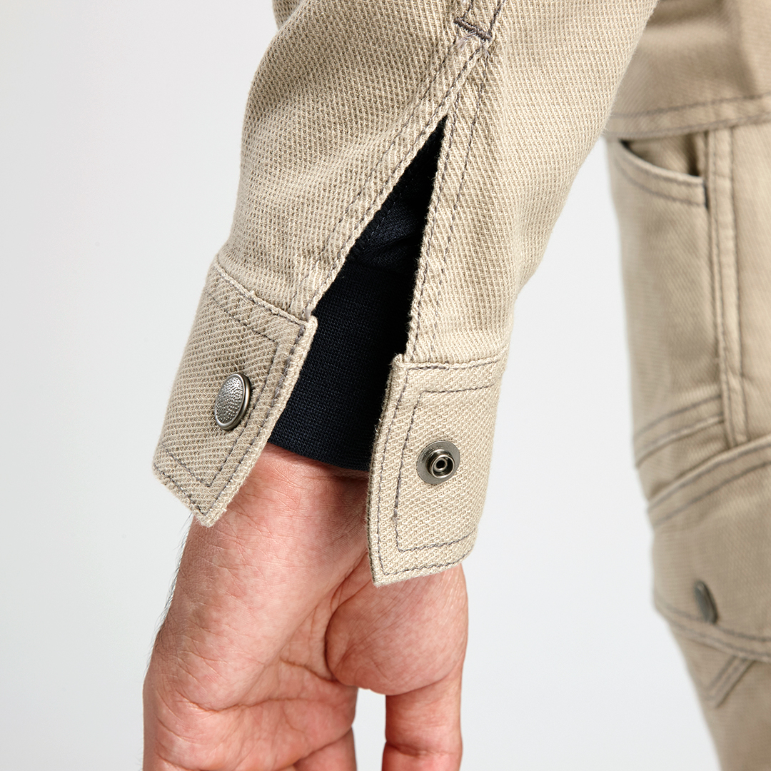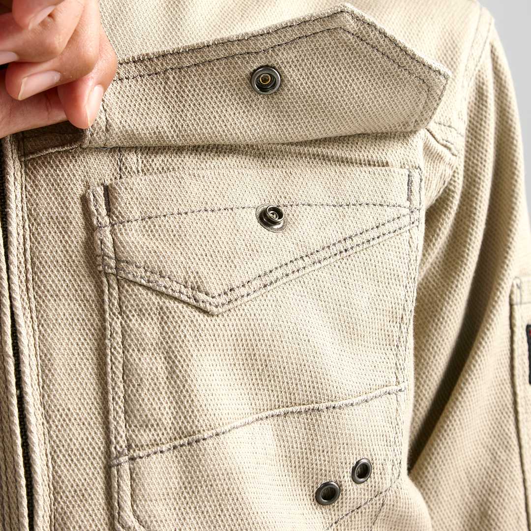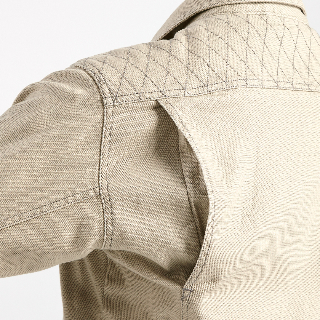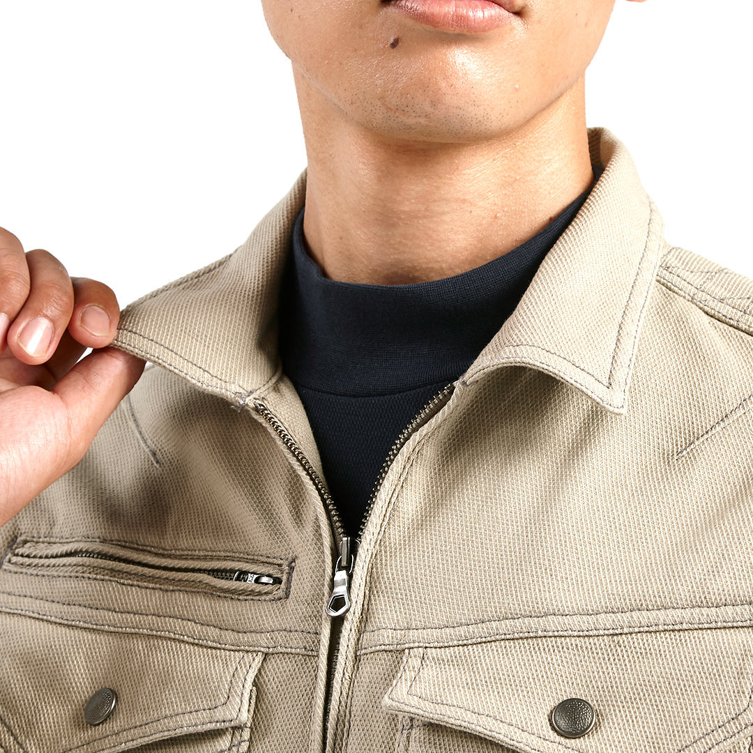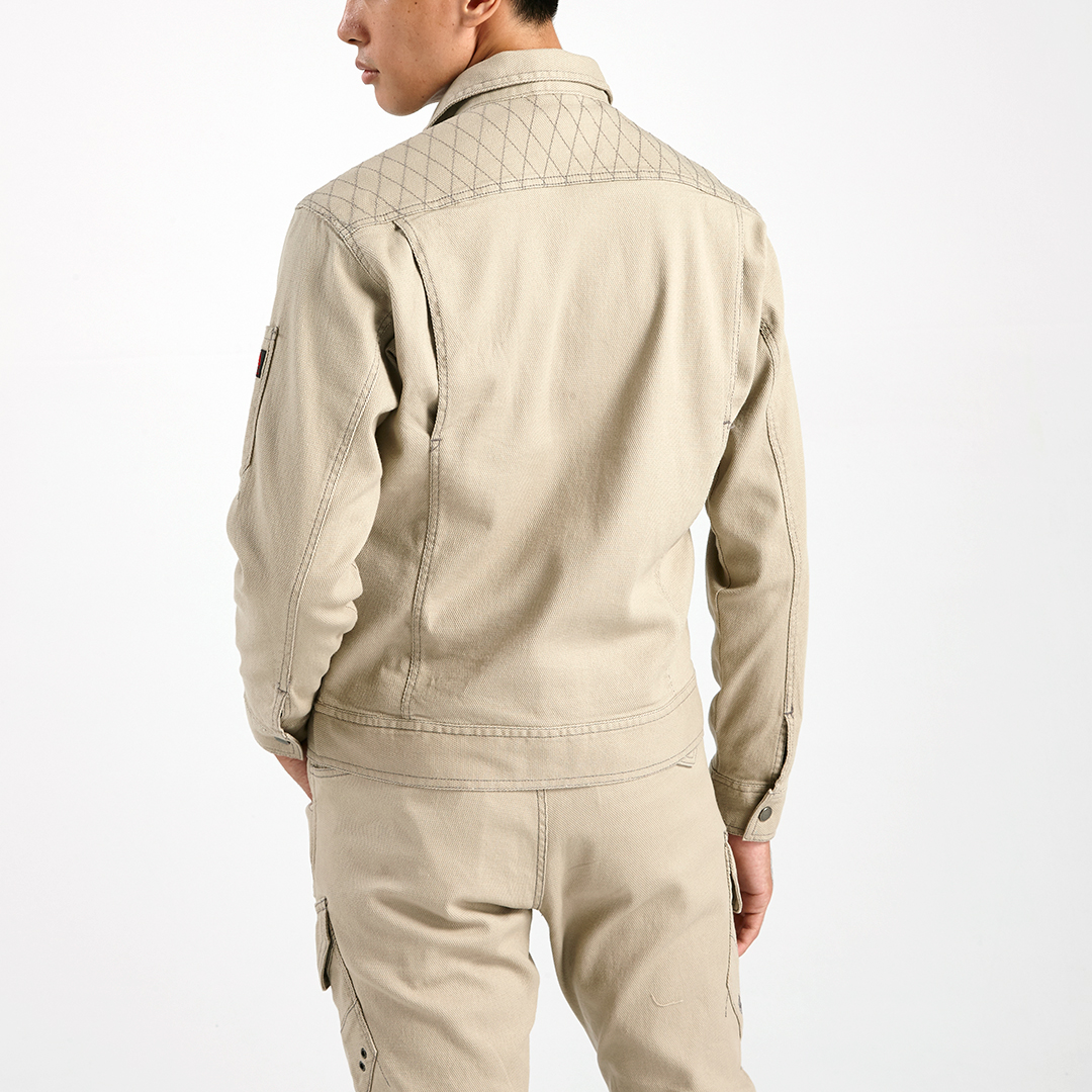 ポリウレタン2%を混紡した肉厚のストレッチ入り綿素材で柔らかい着心地のブルゾンです。背中にはノーフォークを採用。肩や腕がスムーズに動かせるよう工夫されています。肩部分には刺子調の補強ステッチを施し、耐久性にも配慮しました。内ポケットは必要に応じて小物など収納していただけます。独特な切り替えのポケットや左袖の赤色ブランドネーム、右胸ポケットのTORA刺繍などディテールにもこだわった逸品です。