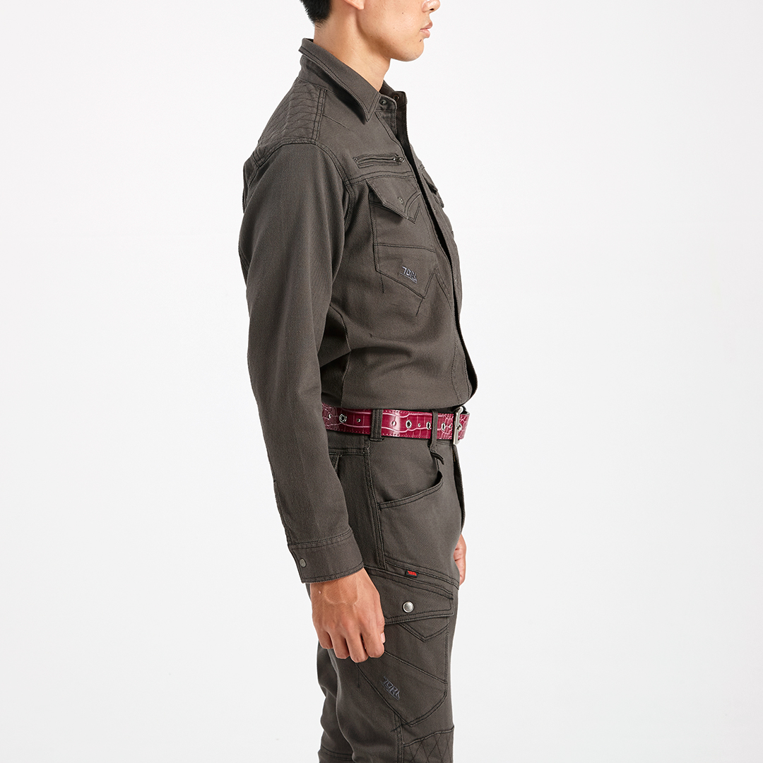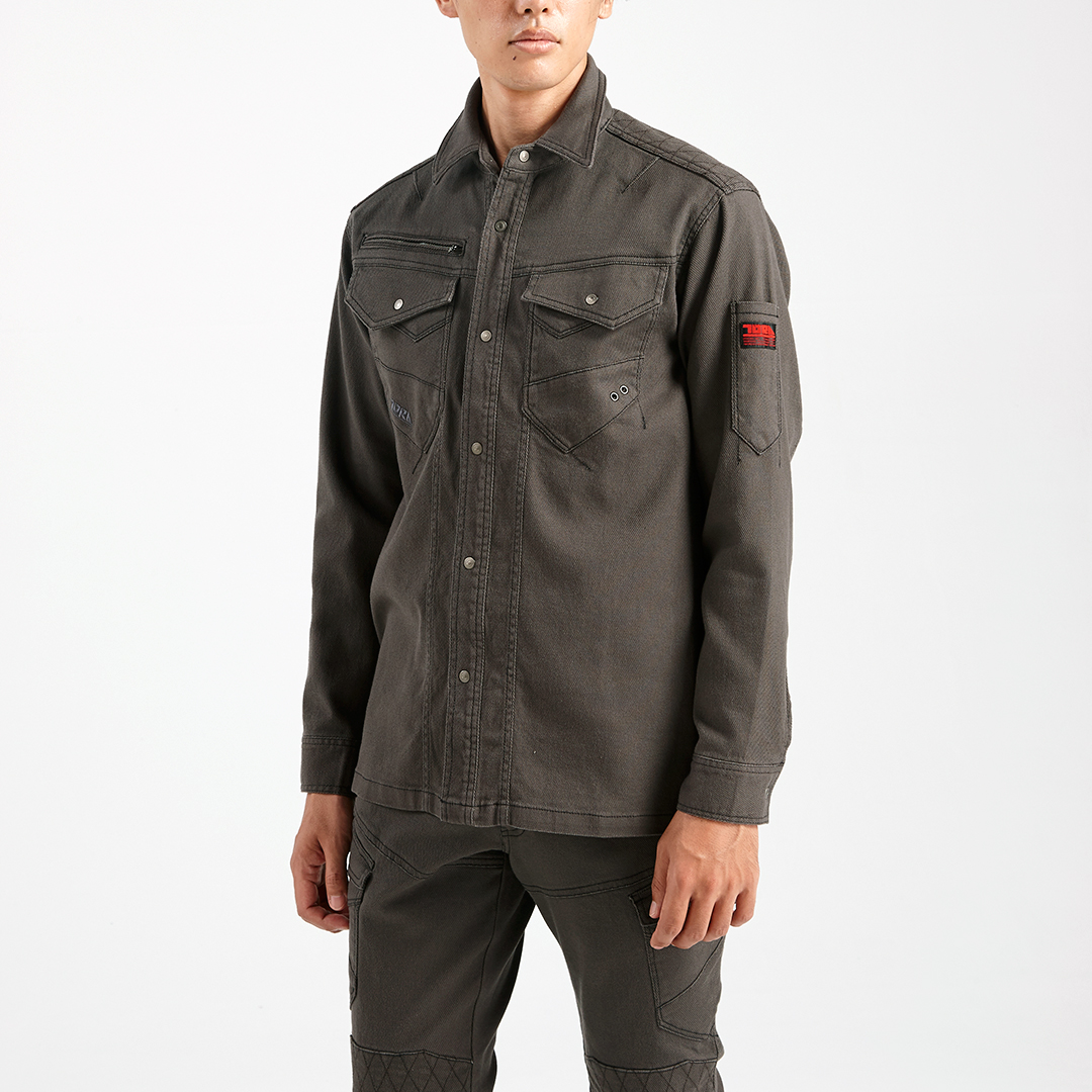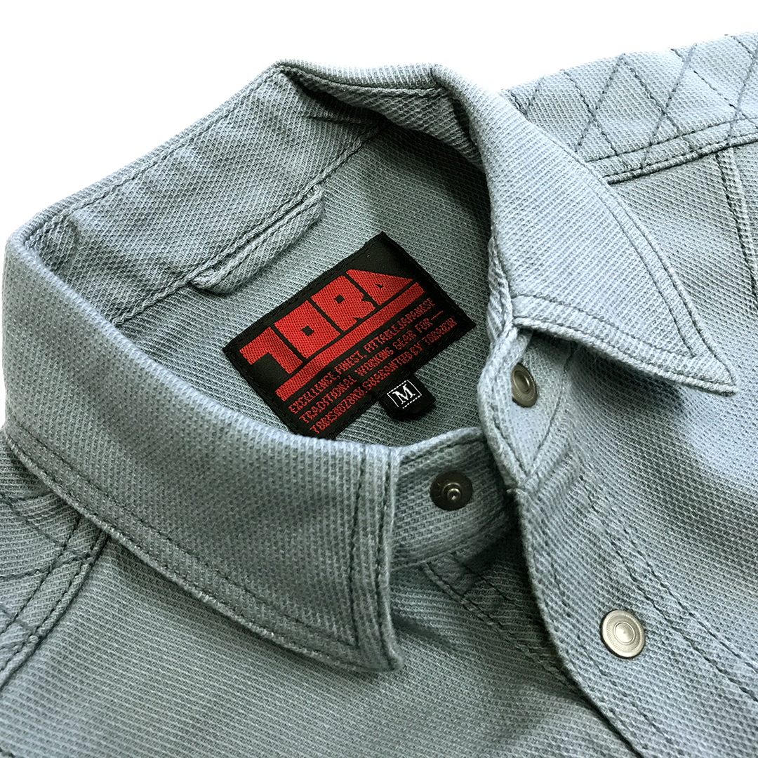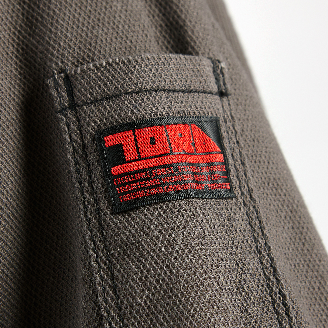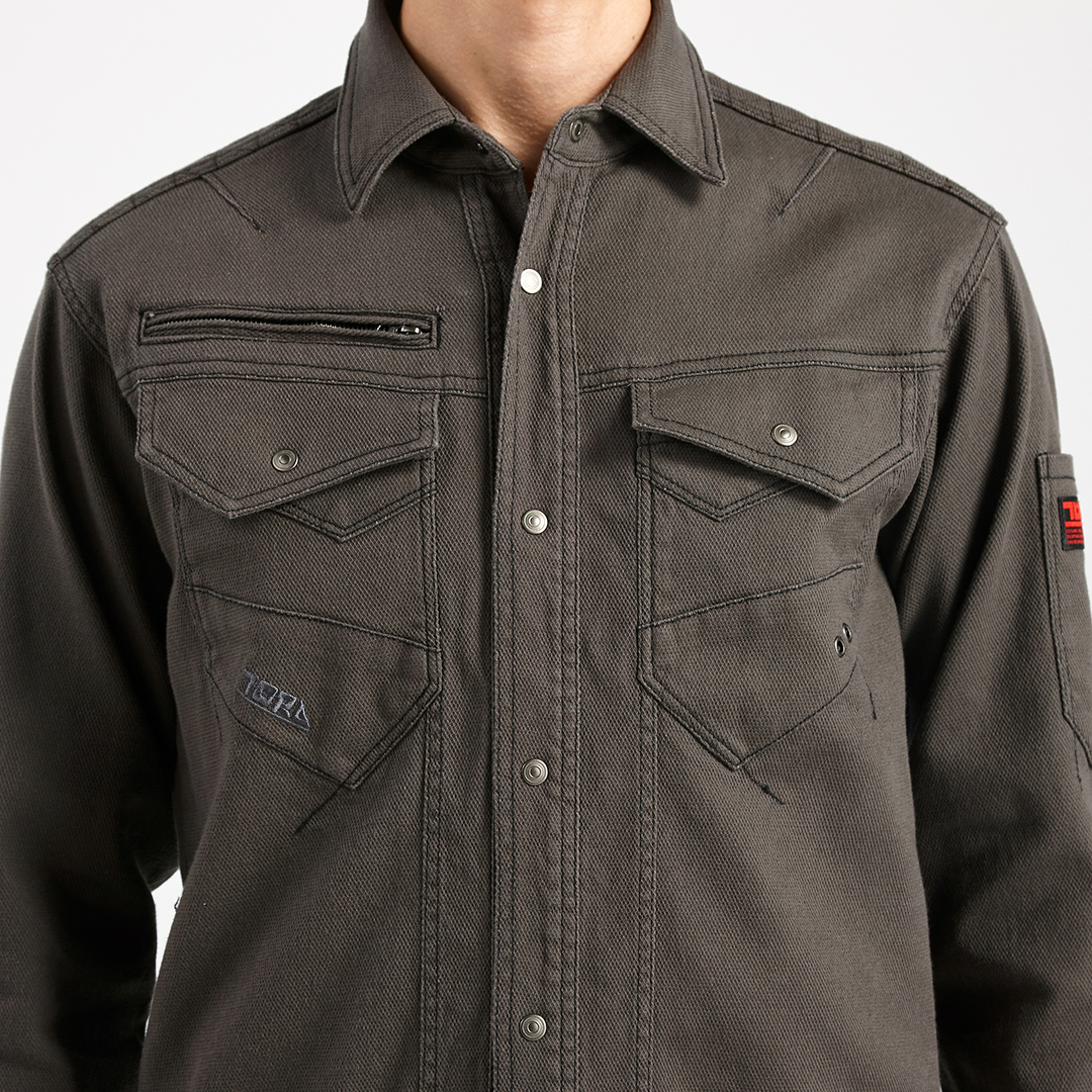 ポリウレタン2%を混紡した肉厚のストレッチ入り綿素材で柔らかい着心地の長袖シャツです。背中にはノーフォークを採用。肩や腕がスムーズに動かせるよう工夫されています。肩部分には刺子調の補強ステッチを施し、耐久性にも配慮しました。独特な切り替えのポケットや左袖の赤色ブランドネーム、右胸ポケットのTORA刺繍などディテールにもこだわった逸品です。