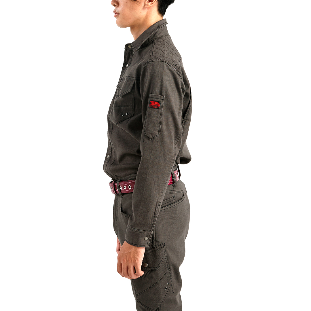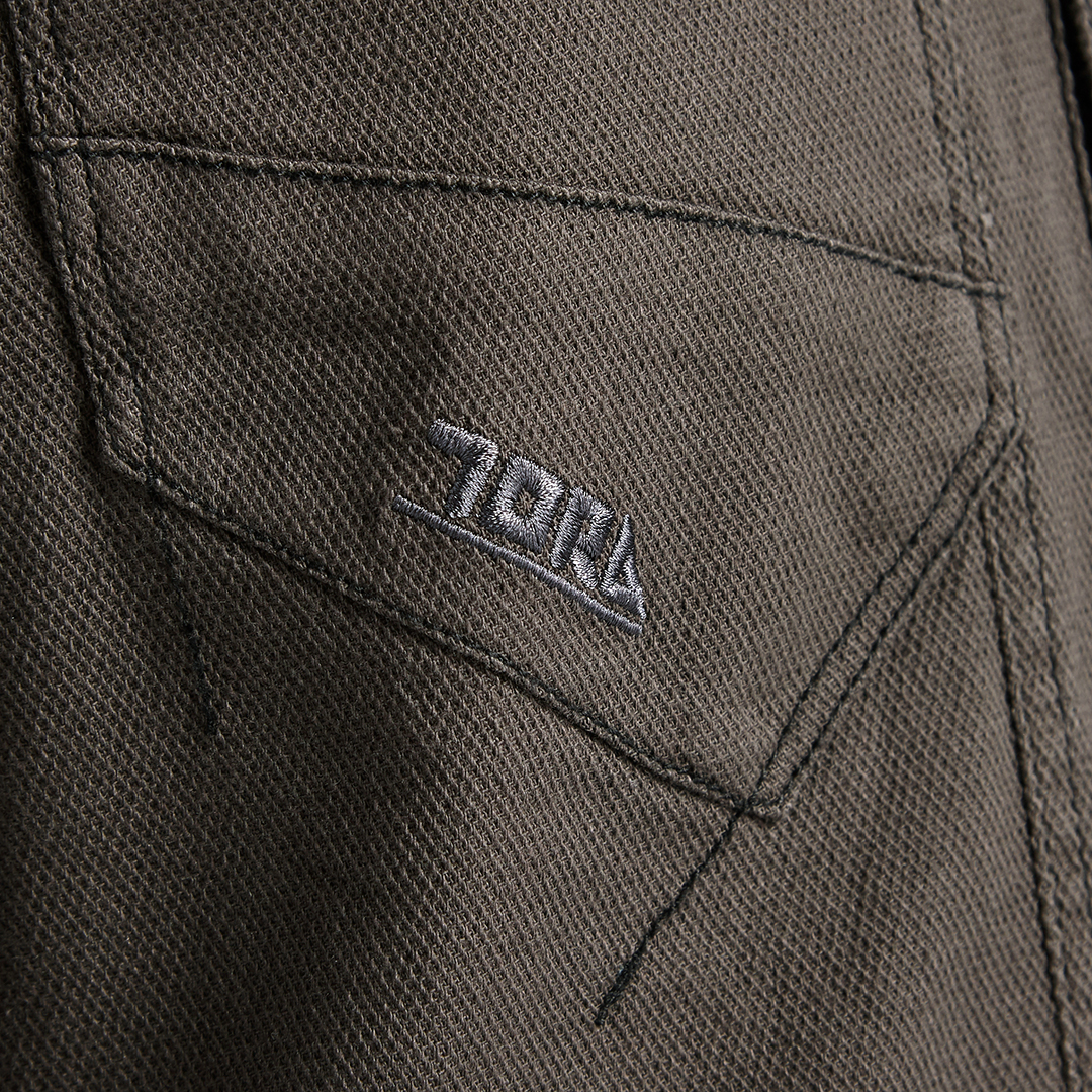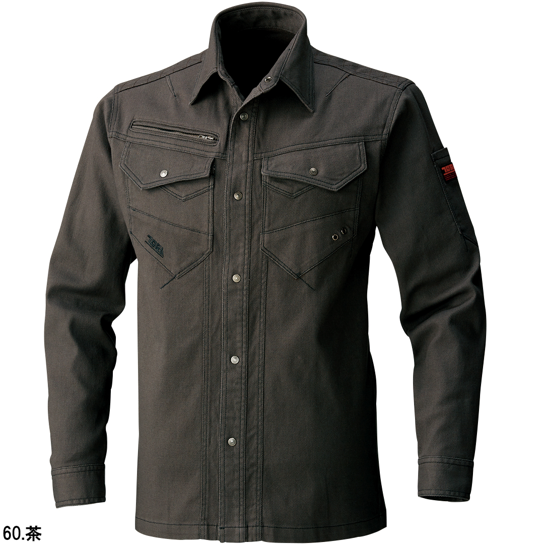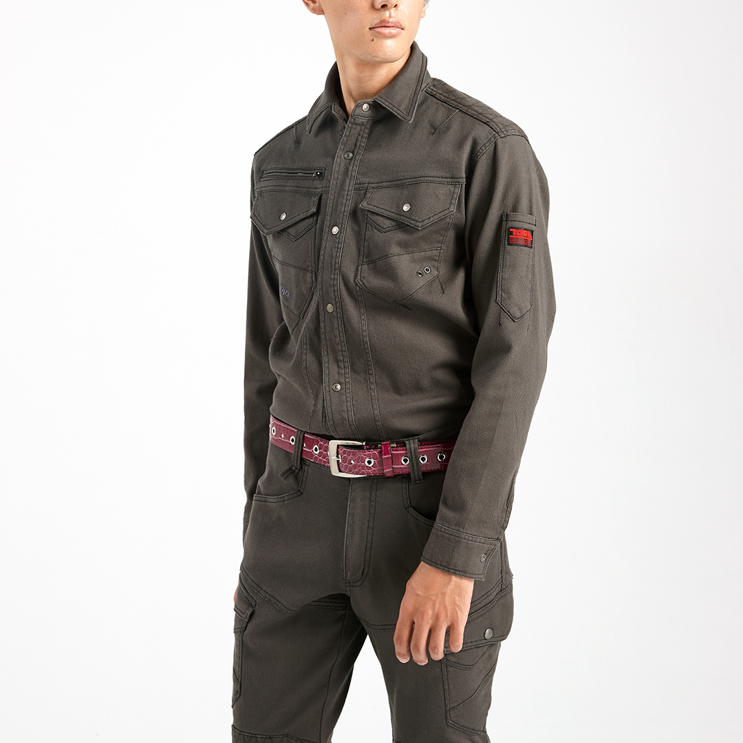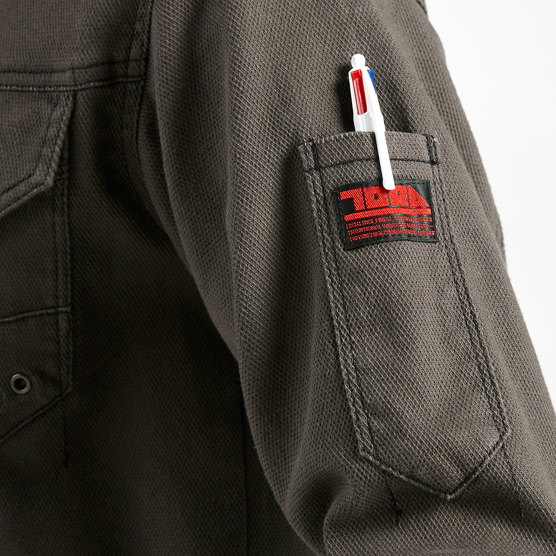 ポリウレタン2%を混紡した肉厚のストレッチ入り綿素材で柔らかい着心地の長袖シャツです。背中にはノーフォークを採用。肩や腕がスムーズに動かせるよう工夫されています。肩部分には刺子調の補強ステッチを施し、耐久性にも配慮しました。独特な切り替えのポケットや左袖の赤色ブランドネーム、右胸ポケットのTORA刺繍などディテールにもこだわった逸品です。