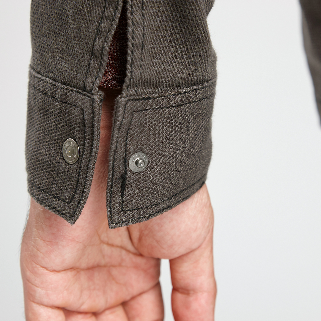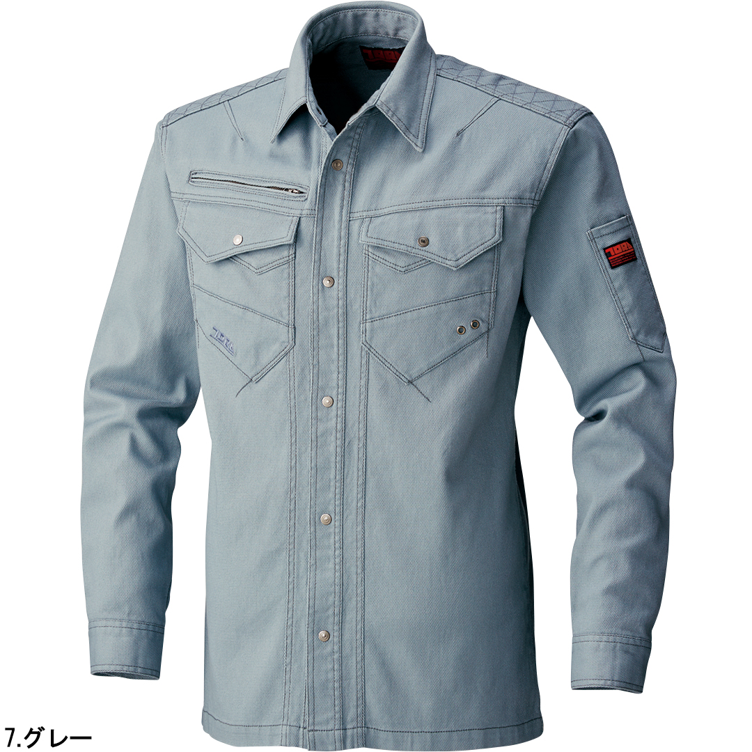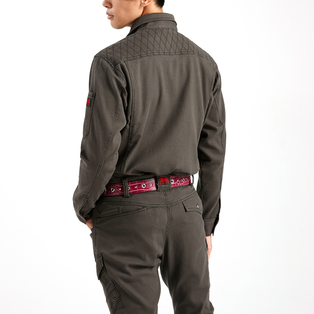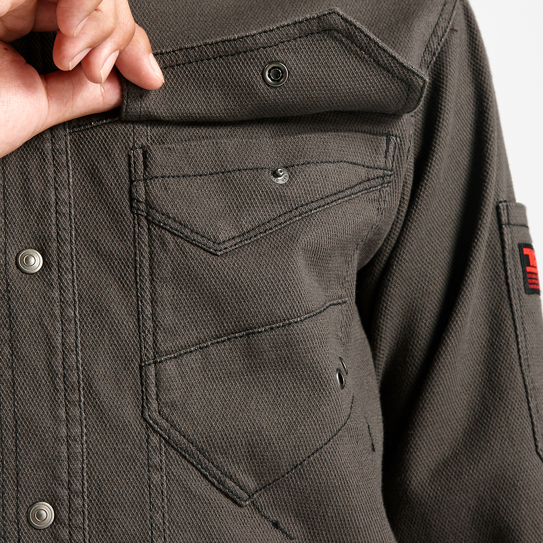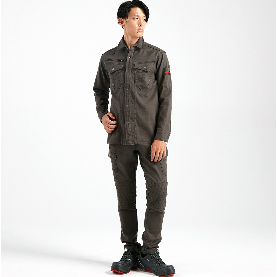 ポリウレタン2%を混紡した肉厚のストレッチ入り綿素材で柔らかい着心地の長袖シャツです。背中にはノーフォークを採用。肩や腕がスムーズに動かせるよう工夫されています。肩部分には刺子調の補強ステッチを施し、耐久性にも配慮しました。独特な切り替えのポケットや左袖の赤色ブランドネーム、右胸ポケットのTORA刺繍などディテールにもこだわった逸品です。