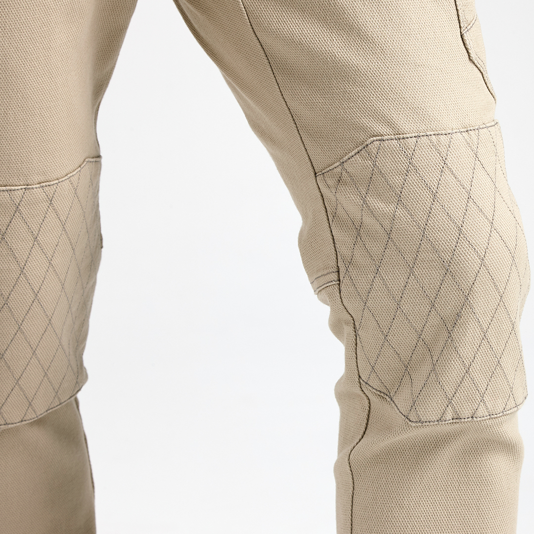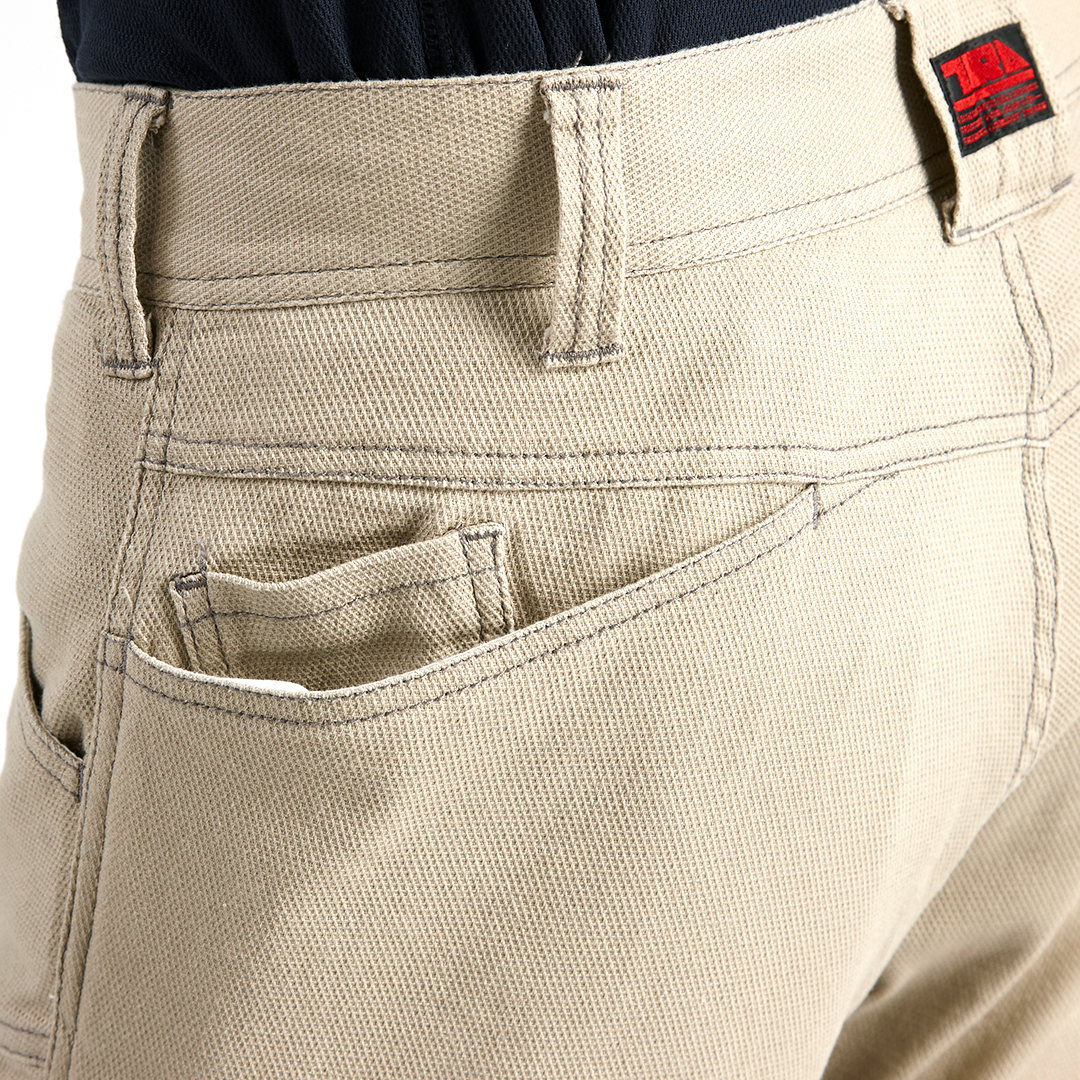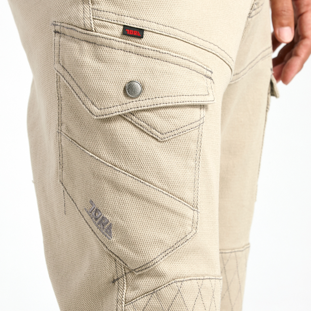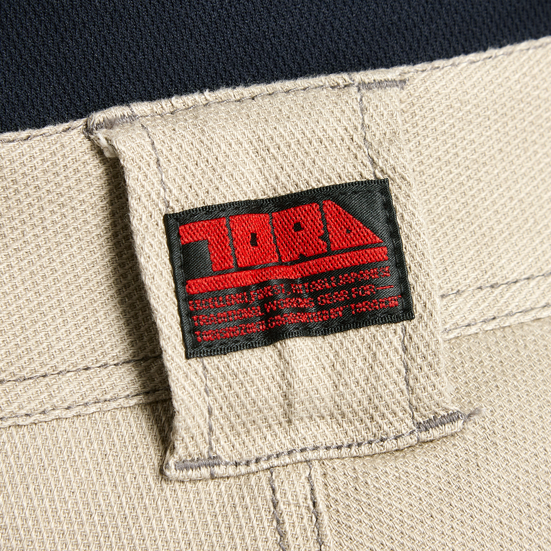 ポリウレタン2%を混紡した肉厚のストレッチ入り綿素材で柔らかい着心地のカーゴパンツです。左後ろ二重ポケットや両サイドカーゴポケット等大小さまざまな収納を確保。右前カラビナ用ループなどの小技も効いた逸品です。膝部分には刺子調の補強ステッチを施し、耐久性にも配慮しました。シンプルな構造ながらも独特な切り替えの両サイドポケットやバックベルトループの赤色ブランドネーム、右サイドポケットのTORA刺繍などディテールにもこだわった逸品です。