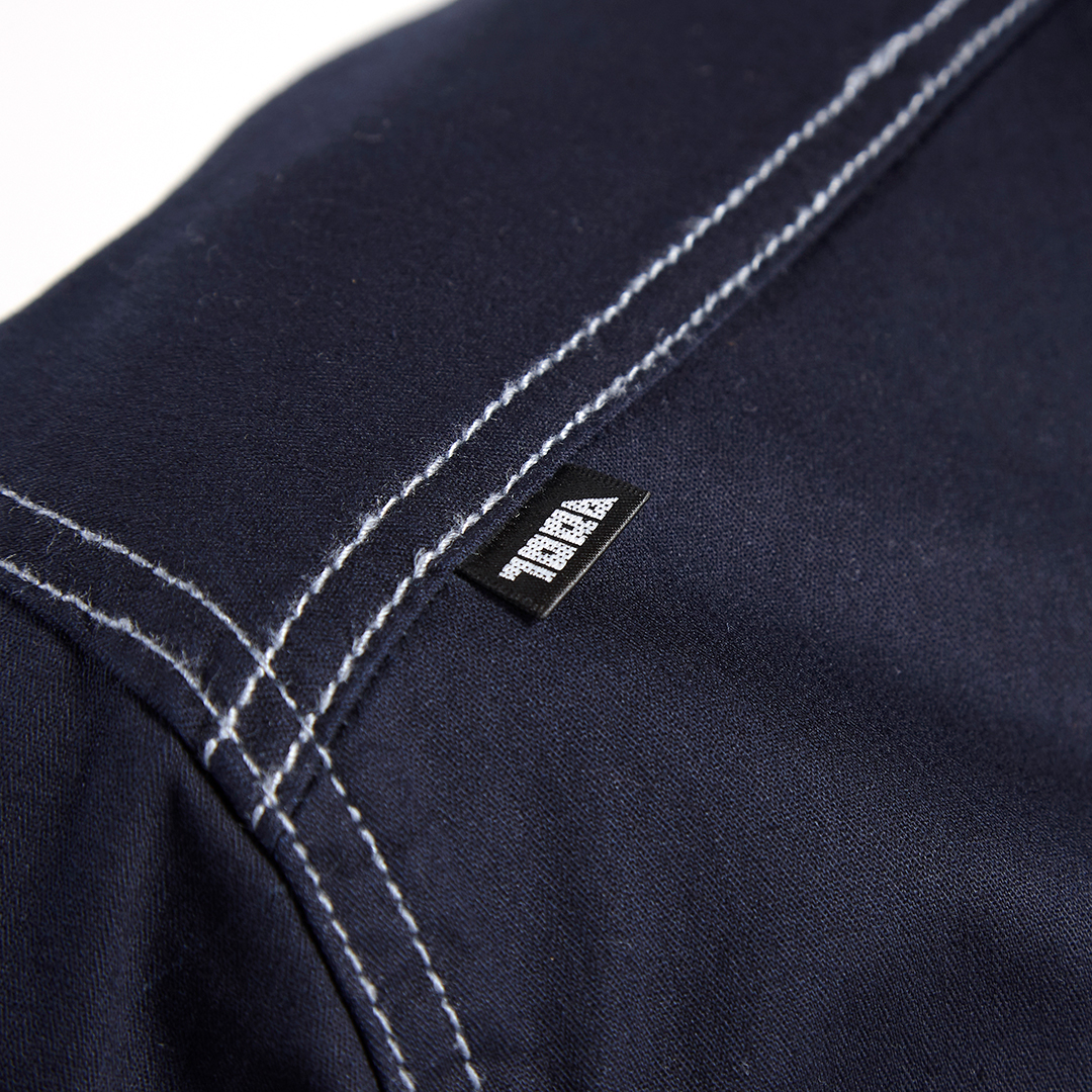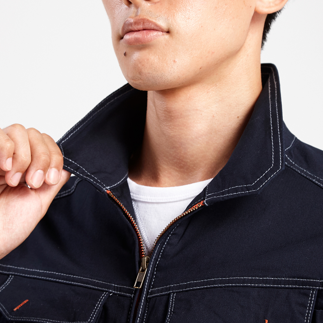 素材にはストレッチミニヘリンボンを採用し、アクティブに動けるブルゾンです。シーム、カンドメ、ファスナーテープの配色などディテールにこだわり、自然なカジュアル感を演出。折襟で正装感もミックスしました。