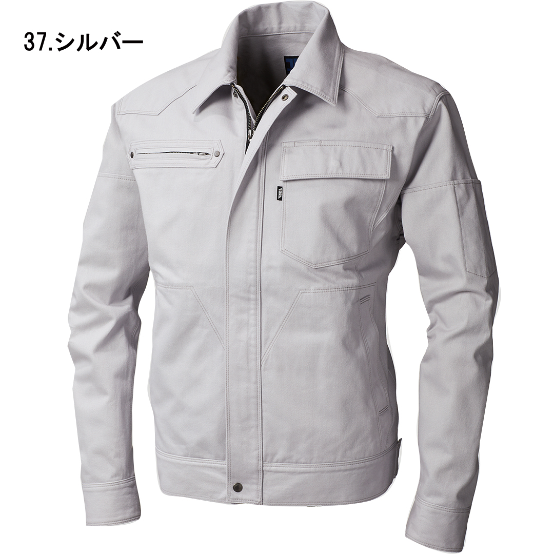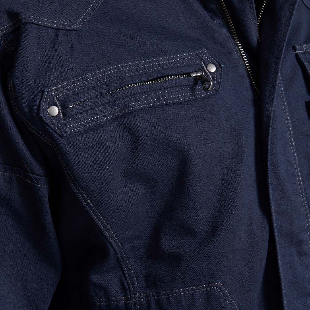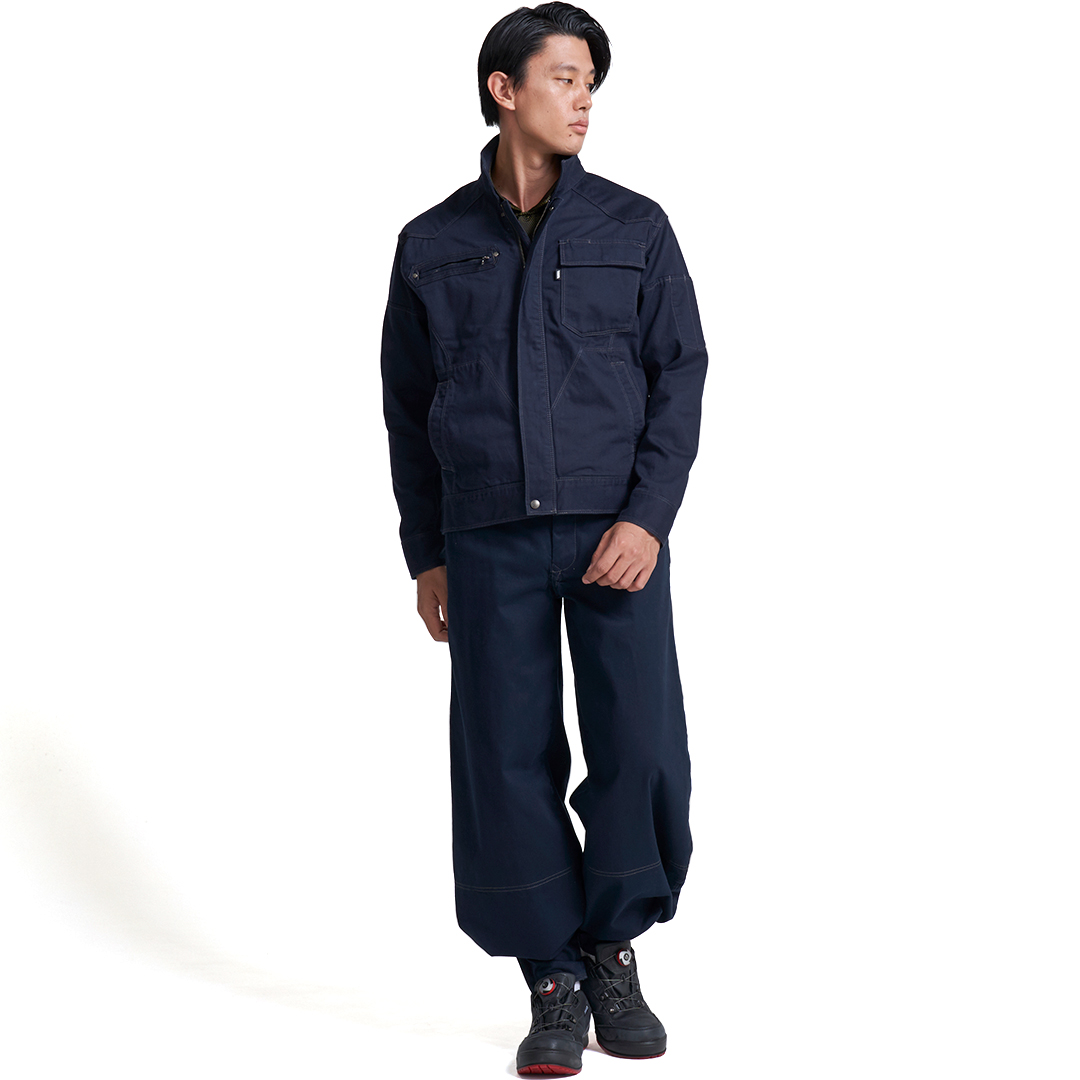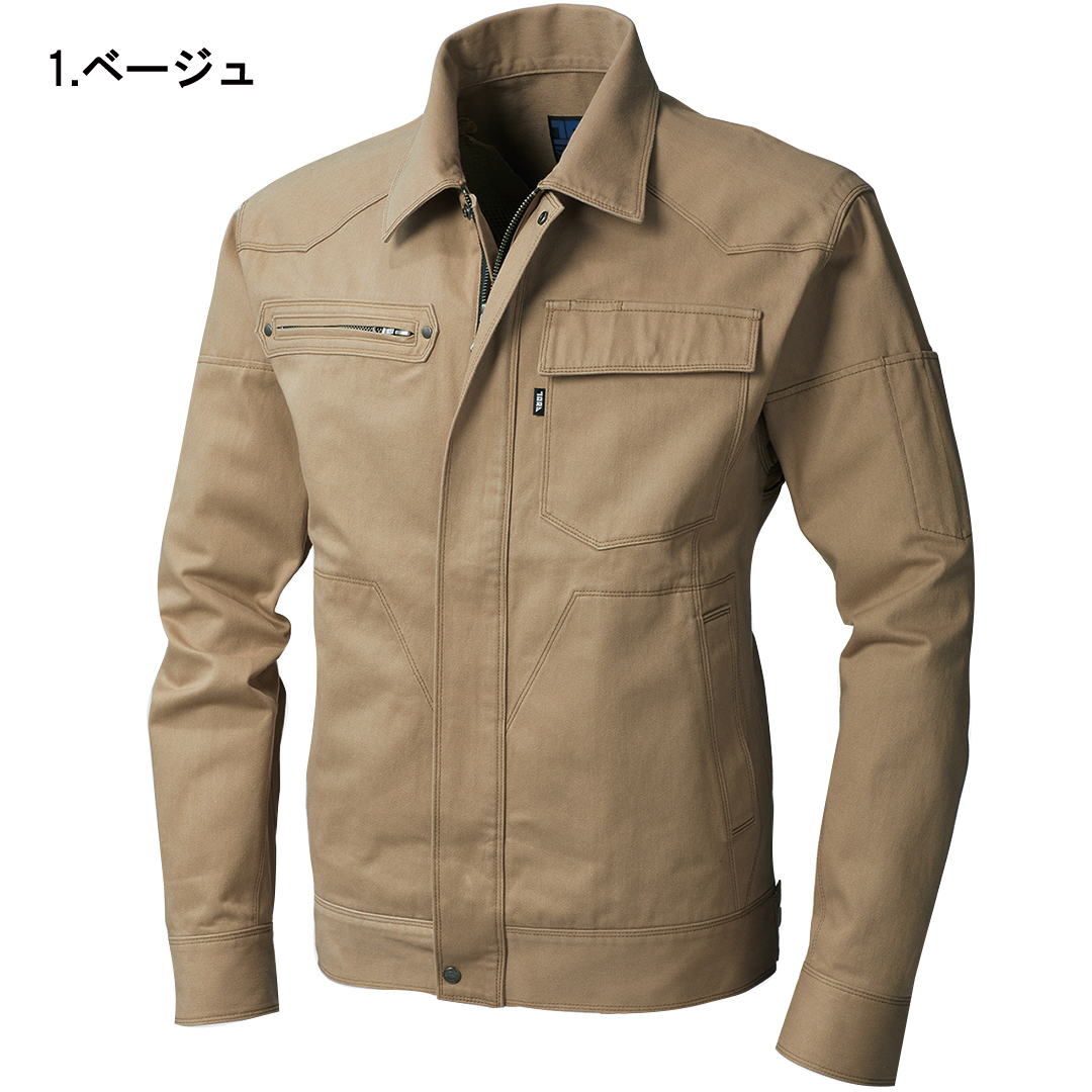 「ブルーラベル寅壱」に綿100%素材の新モデル登場。オールマイティに着られる正統スタイルの長袖ブルゾン。綿素材ならではのソフトな肌触りが特徴。溶接現場での使用にも対応するファスナー隠し仕様。