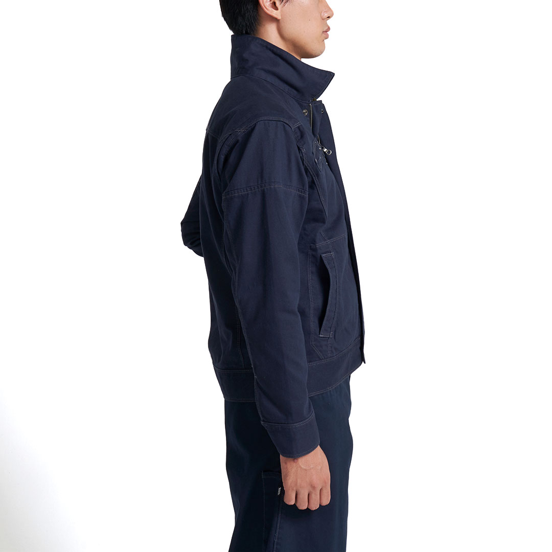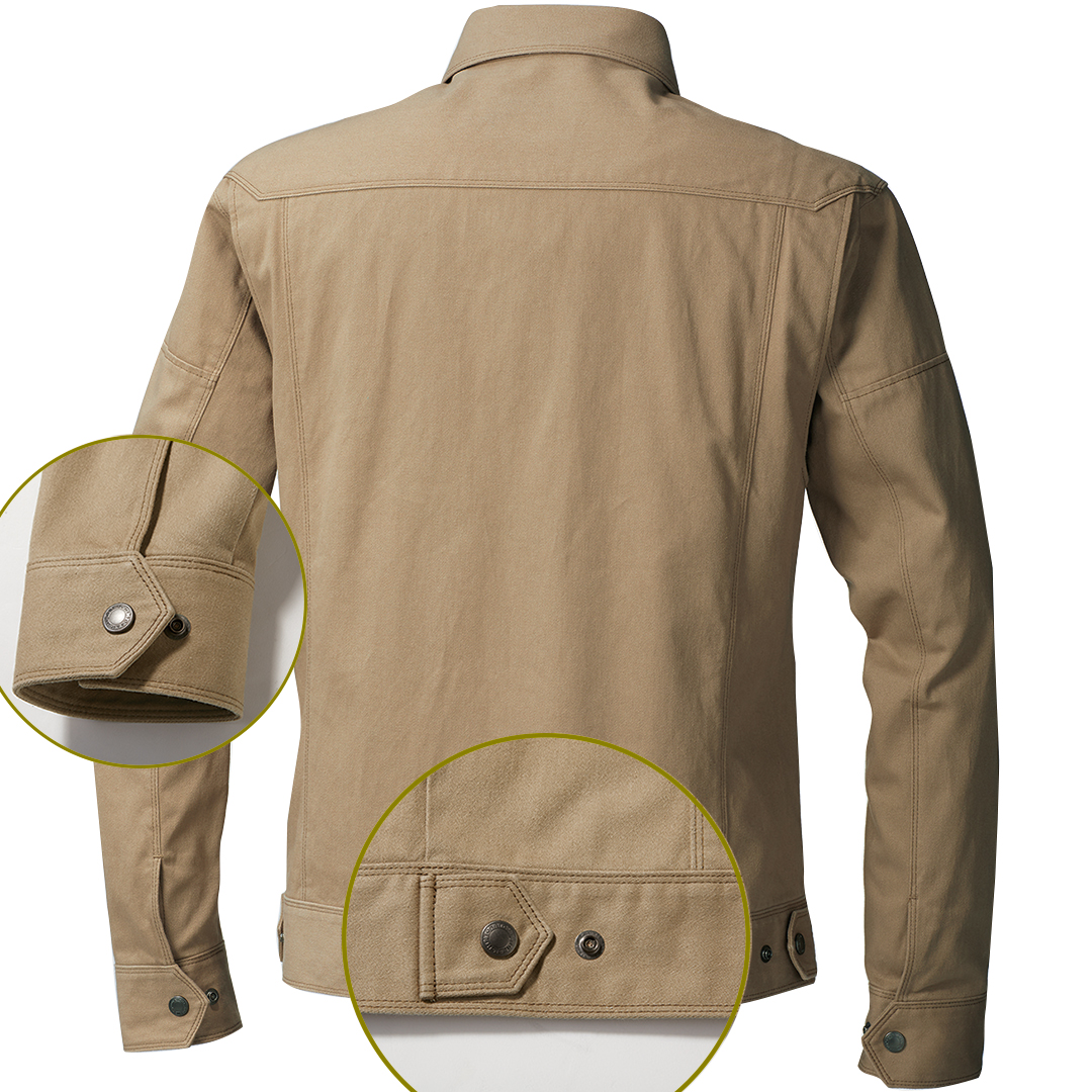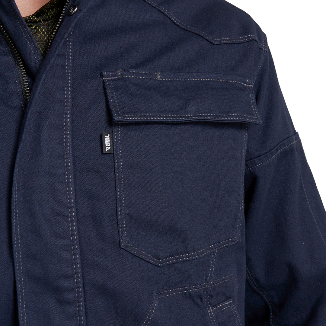 「ブルーラベル寅壱」に綿100%素材の新モデル登場。オールマイティに着られる正統スタイルの長袖ブルゾン。綿素材ならではのソフトな肌触りが特徴。溶接現場での使用にも対応するファスナー隠し仕様。