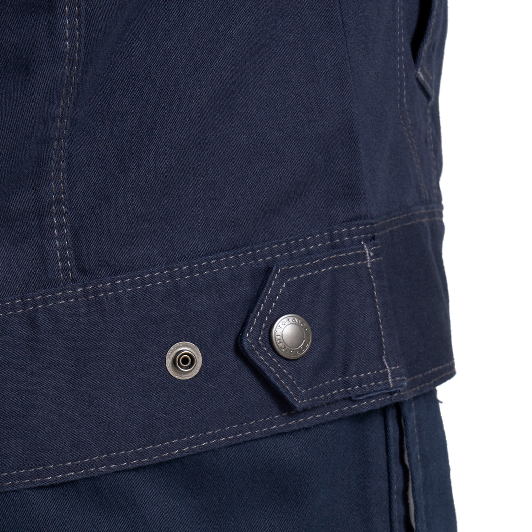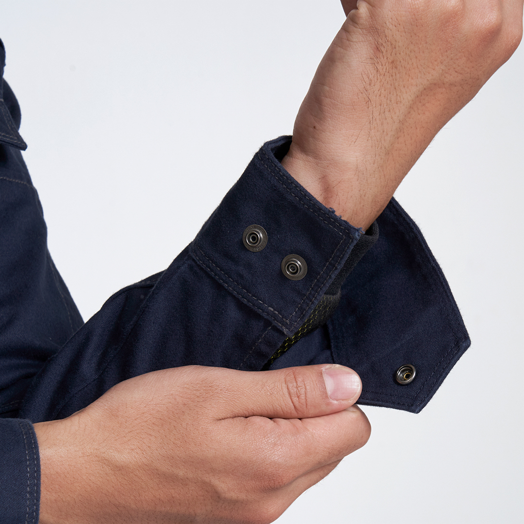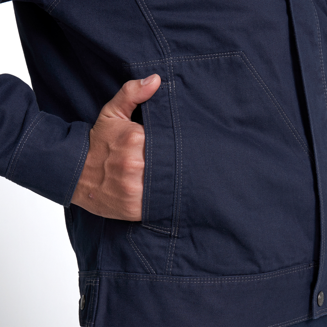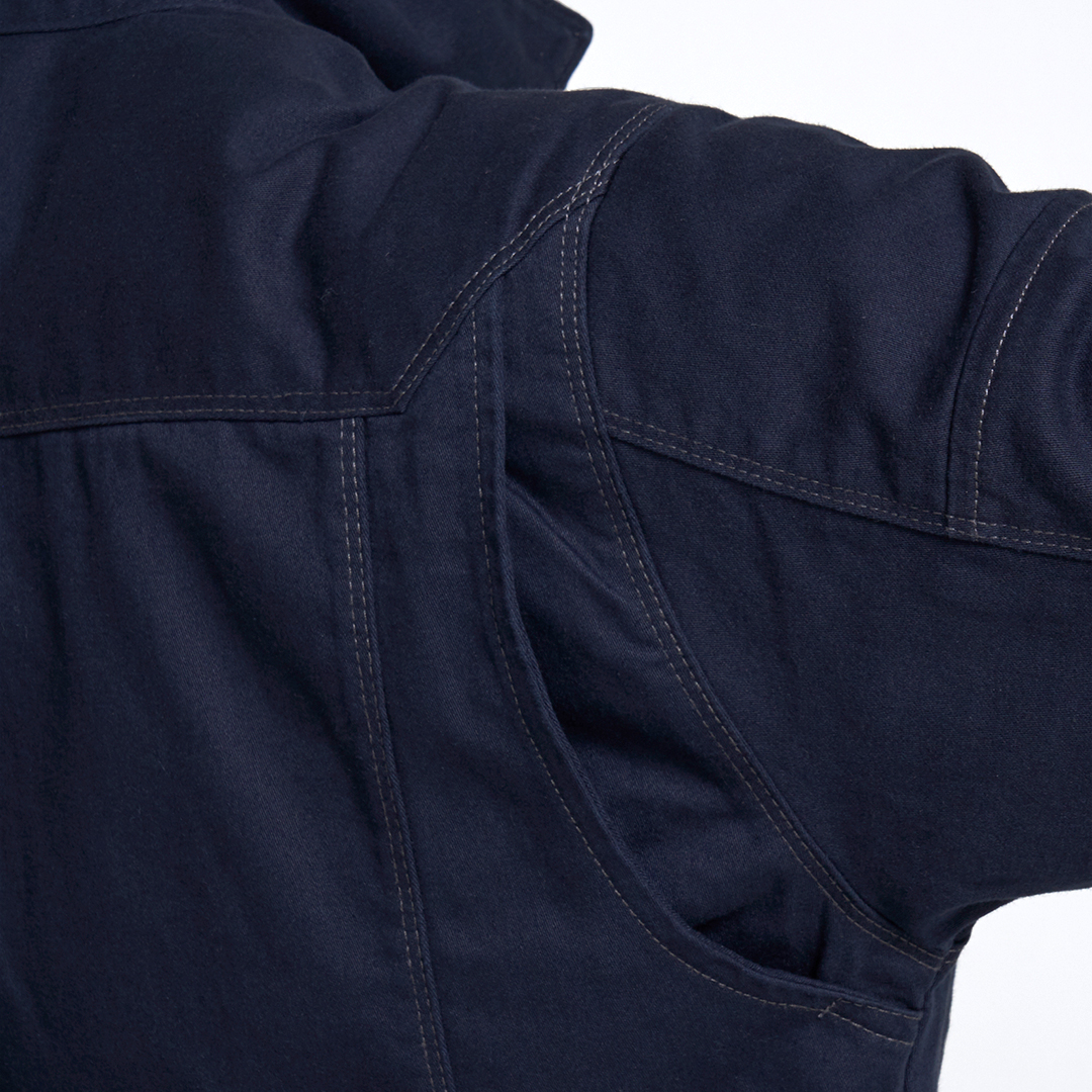 「ブルーラベル寅壱」に綿100%素材の新モデル登場。オールマイティに着られる正統スタイルの長袖ブルゾン。綿素材ならではのソフトな肌触りが特徴。溶接現場での使用にも対応するファスナー隠し仕様。