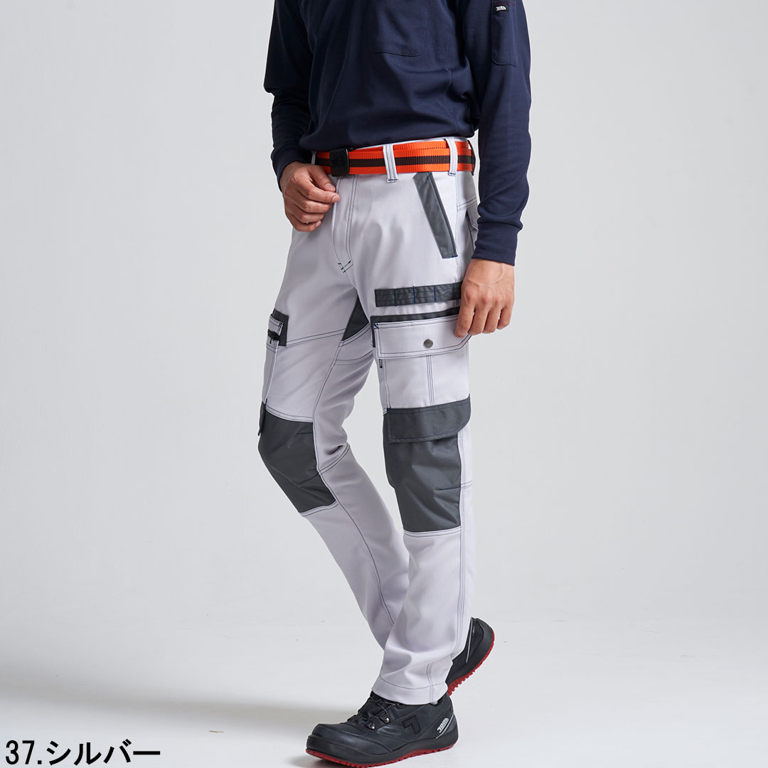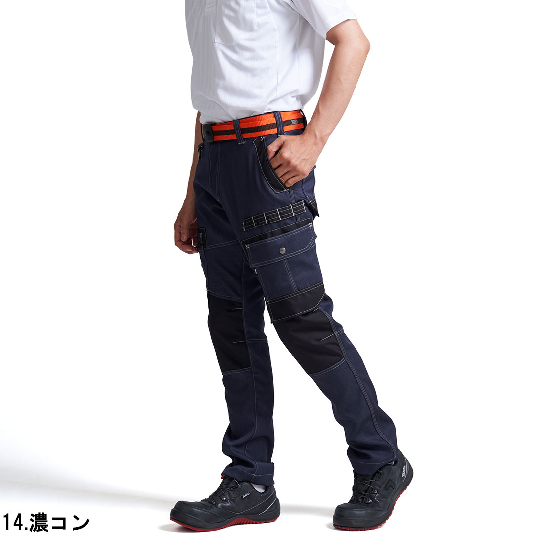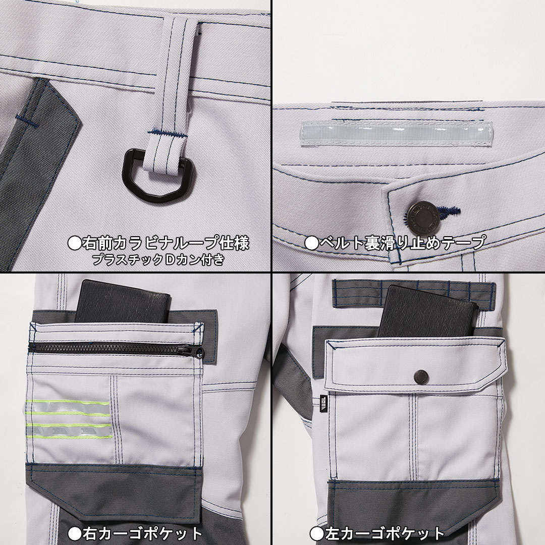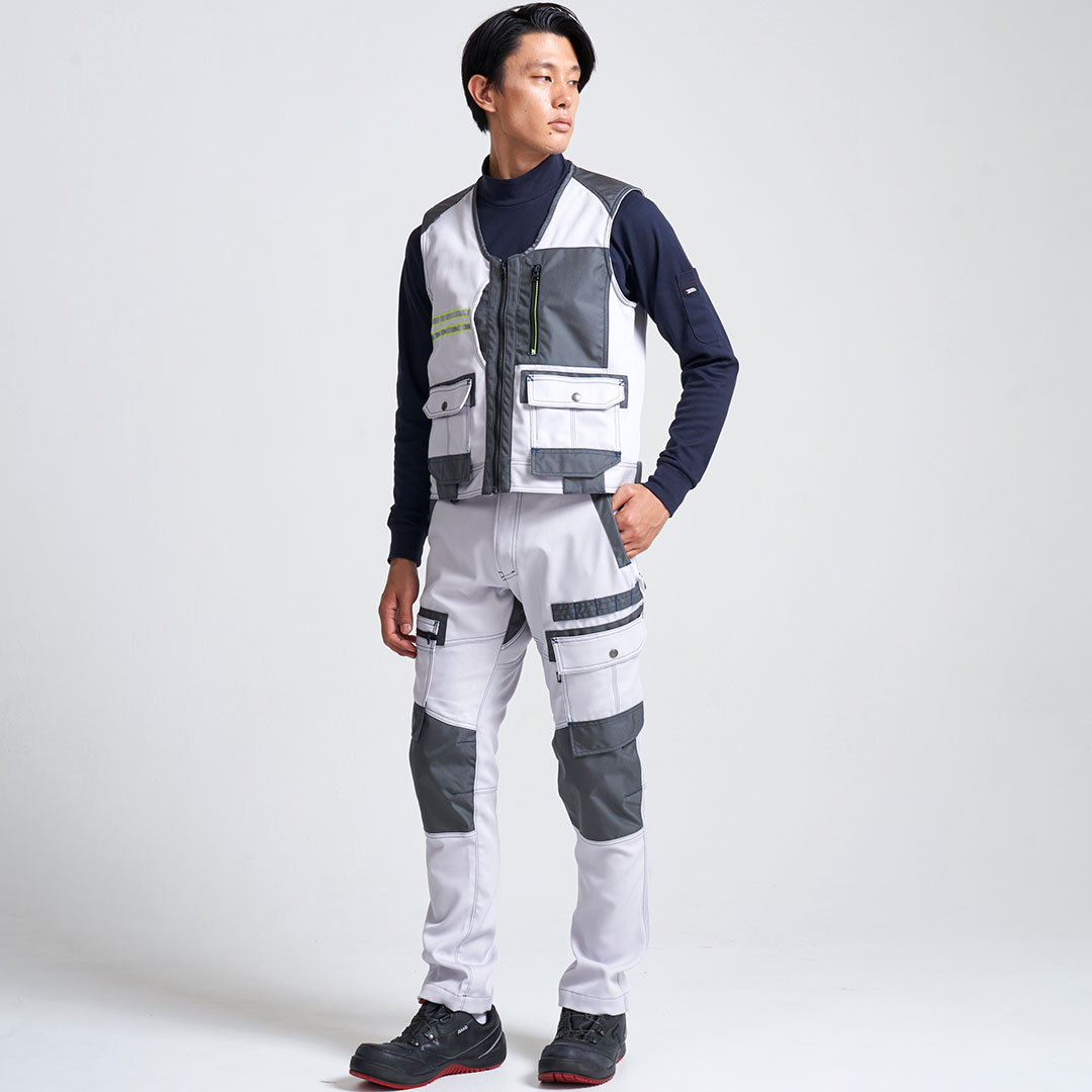 軽量、しなやかな素材と高耐久素材のコラボ。2つの素材のコラボレーションによって、吸汗速乾とともに帯電防止や高耐久性を実現。しかも随所に施された反射テープによって高い安全性に配慮した高機能カーゴパンツ。