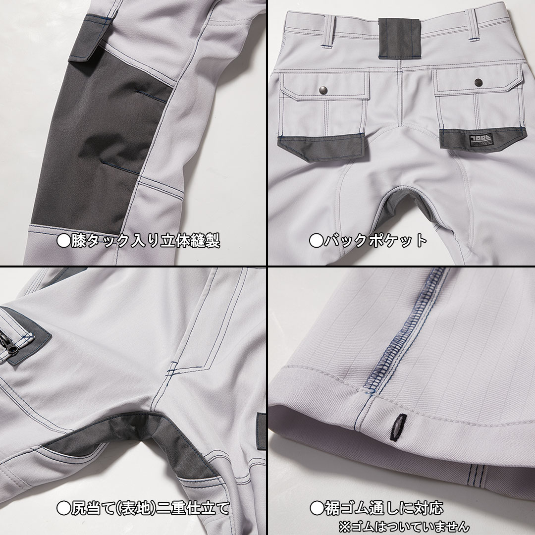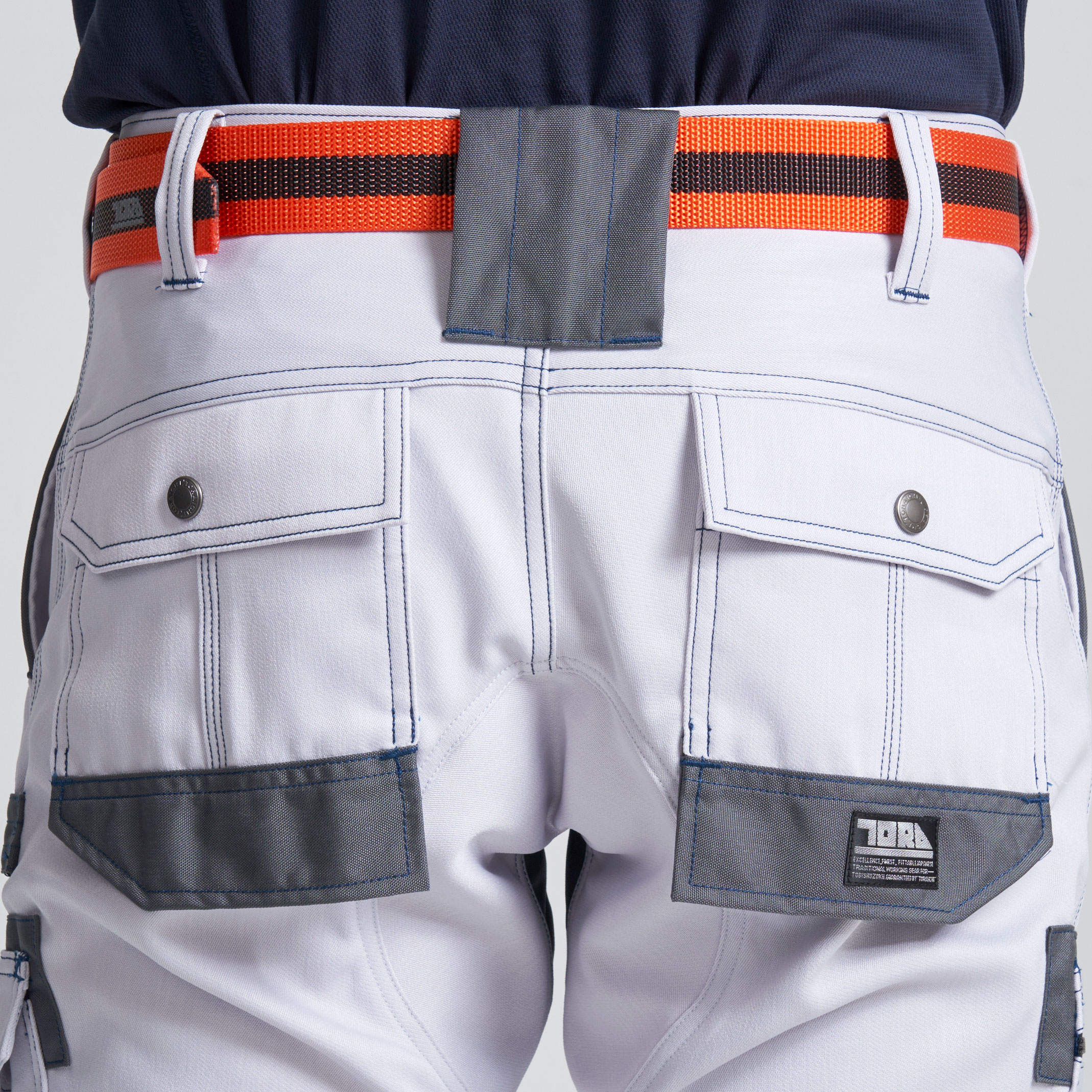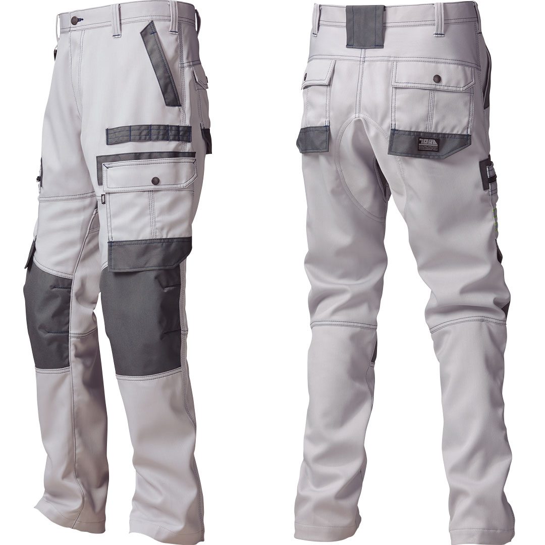 軽量、しなやかな素材と高耐久素材のコラボ。2つの素材のコラボレーションによって、吸汗速乾とともに帯電防止や高耐久性を実現。しかも随所に施された反射テープによって高い安全性に配慮した高機能カーゴパンツ。