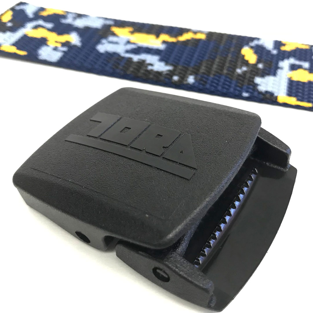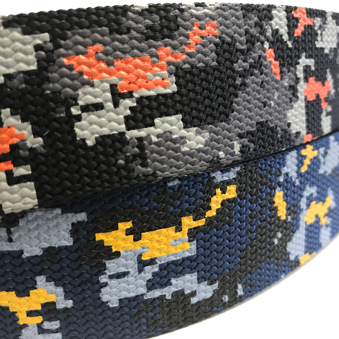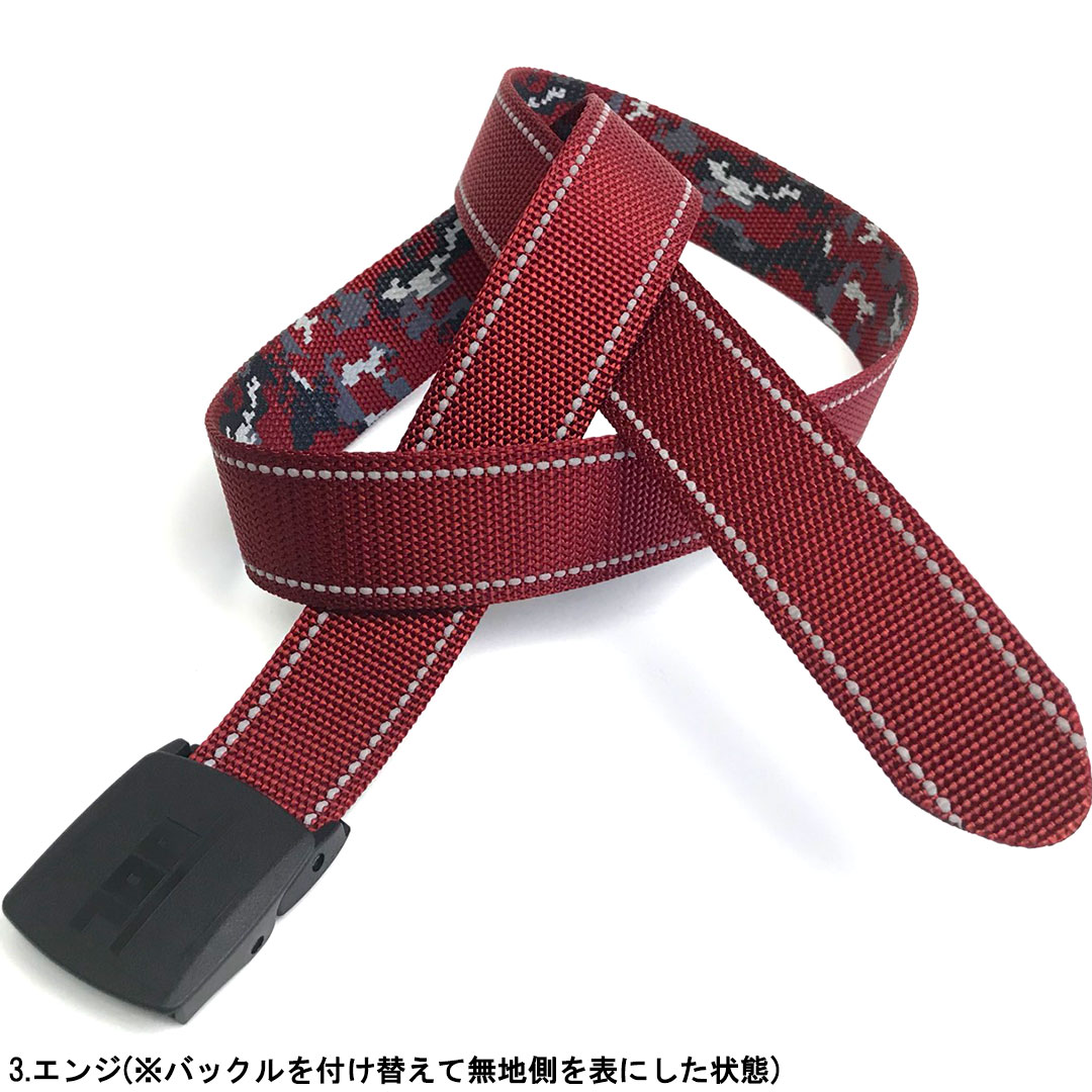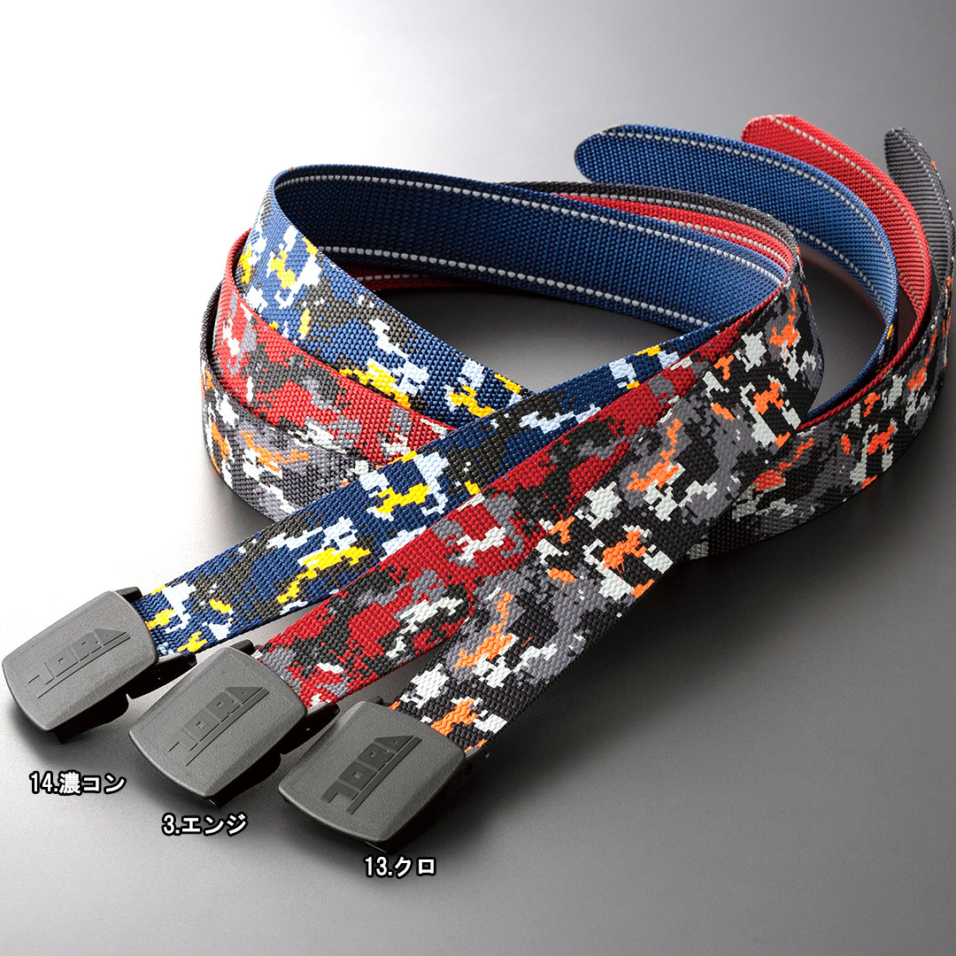 耐久性のあるナイロンコードにデジタル迷彩のプリントを施した高強度ナイロンベルト。迷彩柄と無地の2種類の色柄のリバーシブル仕様。無地側には再帰反射糸を織り込み、安全性にも配慮しました。バックルは高強度プラスチック製で金属アレルギーのユーザーでも安心してお使い頂けます。38mm幅。