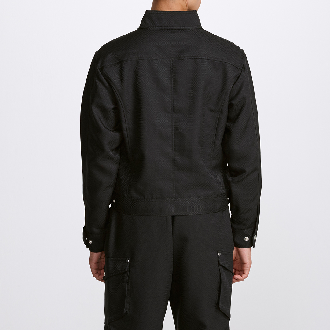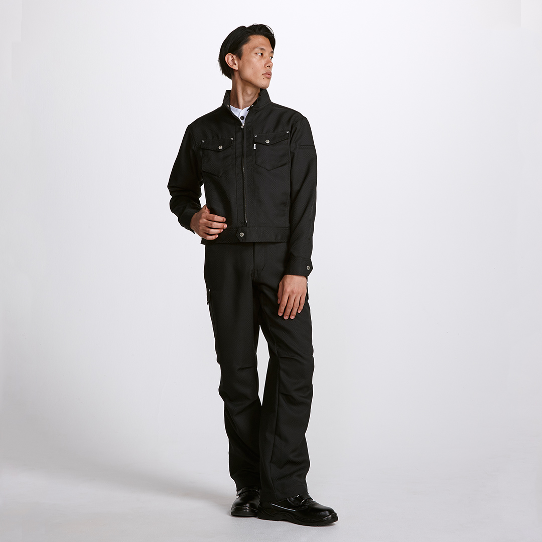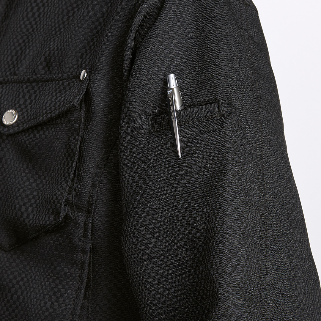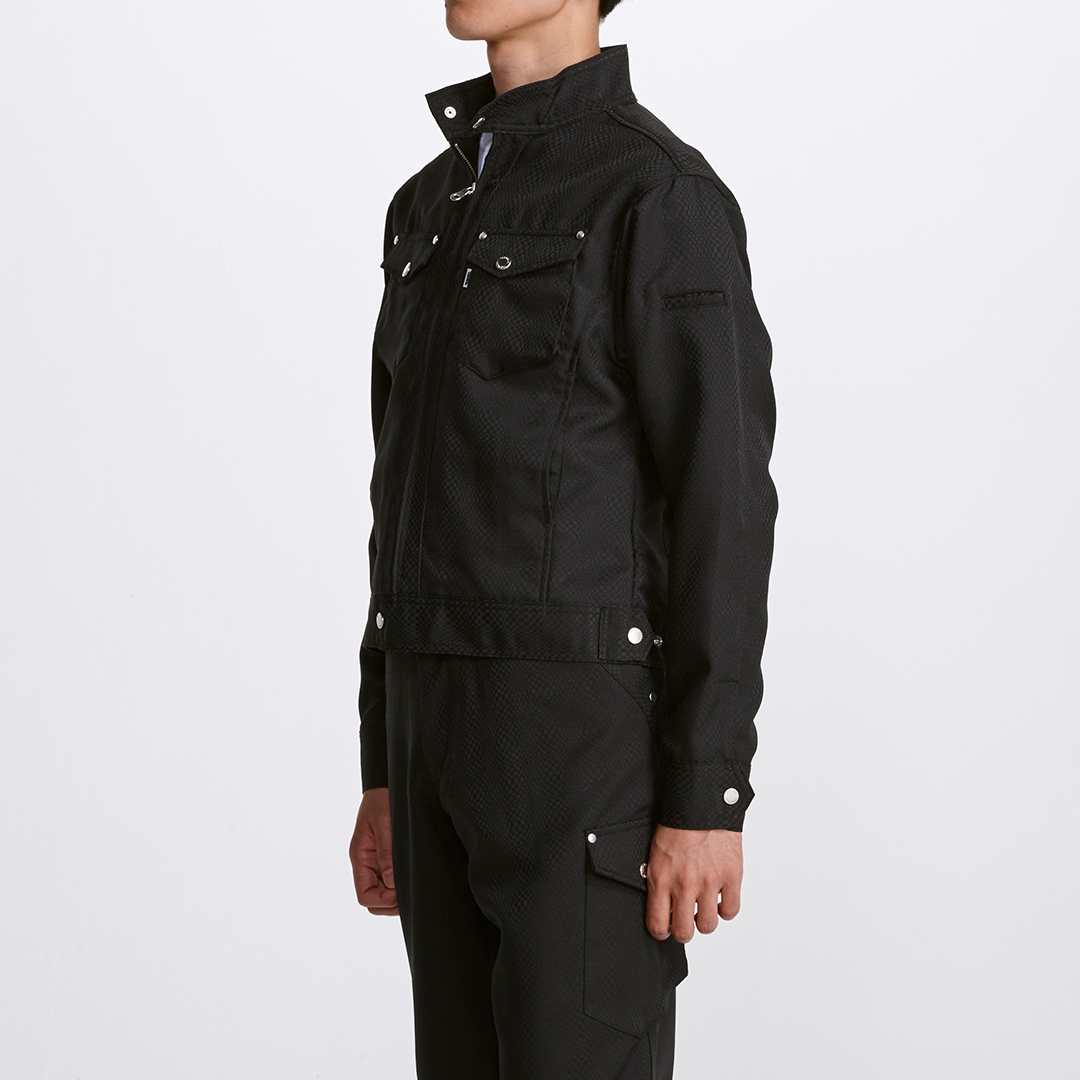 メタルボタンとファスナー使いの斬新さが、引き締まったワークスタイルを可能にします。