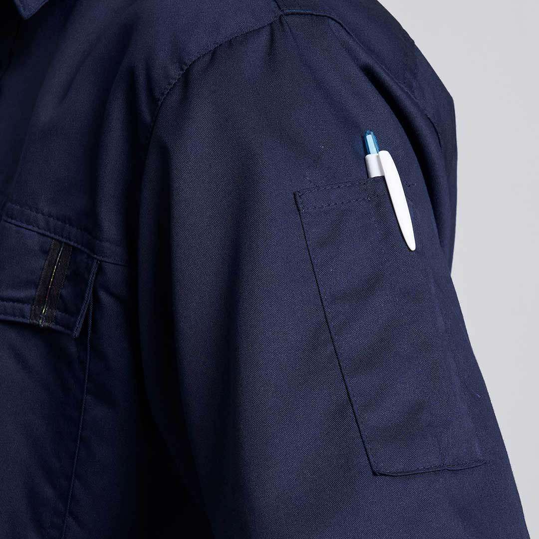 ●衿裏メッシュ仕様●オリジナルドットボタン●ペン差し付胸ポケット●袖ペン差し付●袖口アジャスター