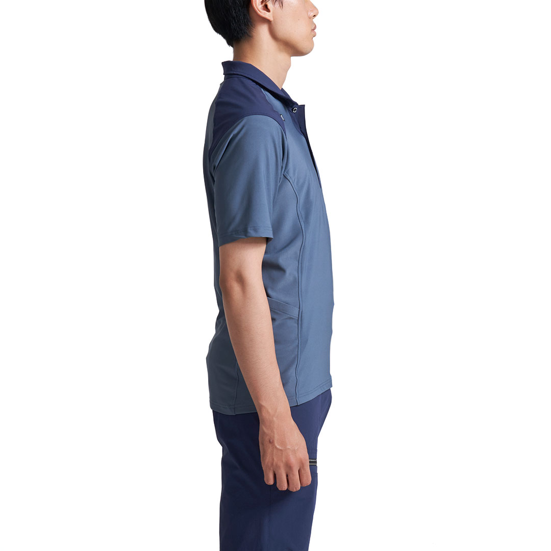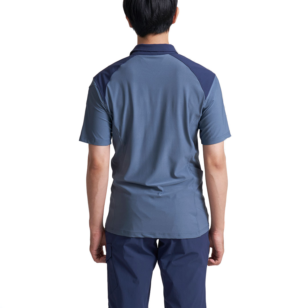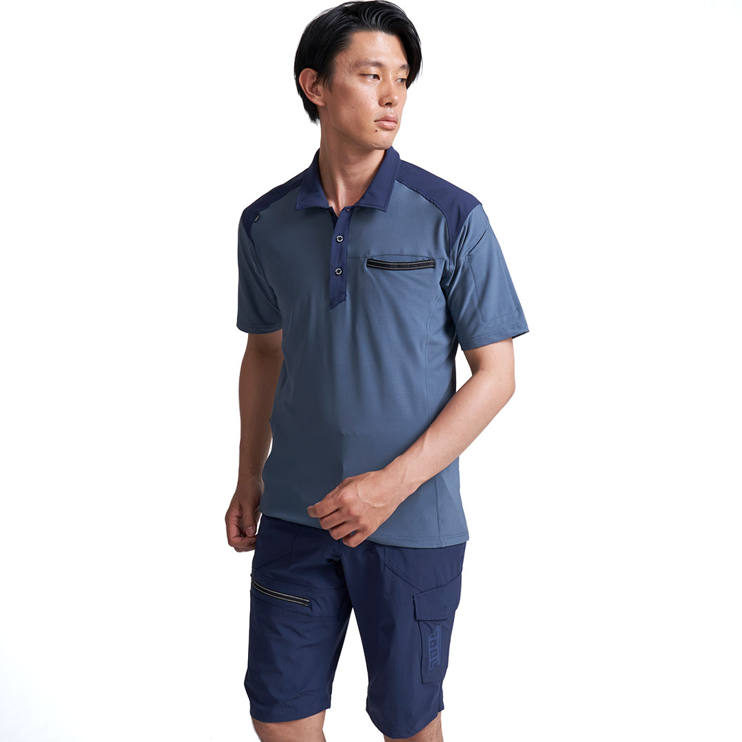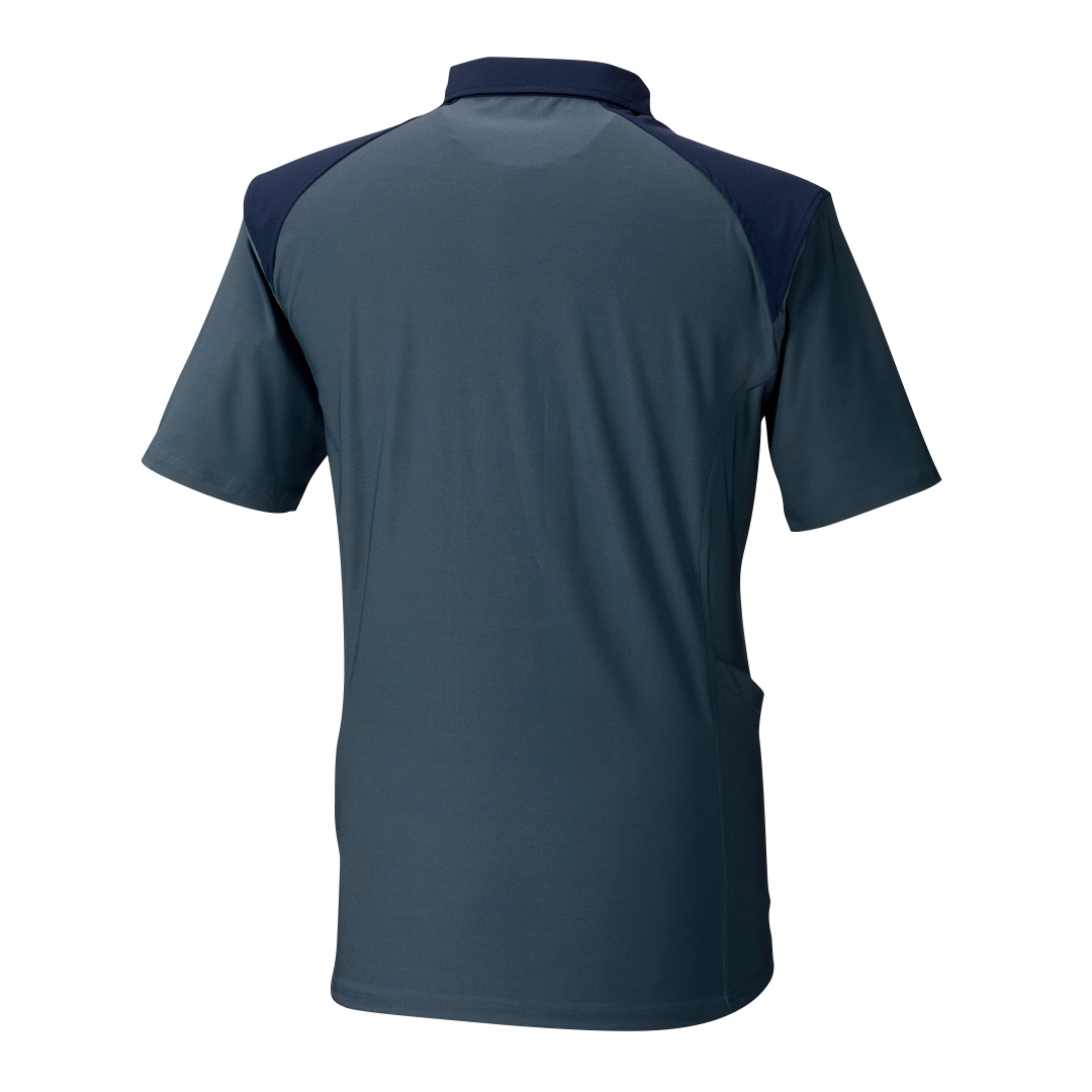 肩や衿に摩耗防止の布帛素材をプラスした半袖ポロシャツ。