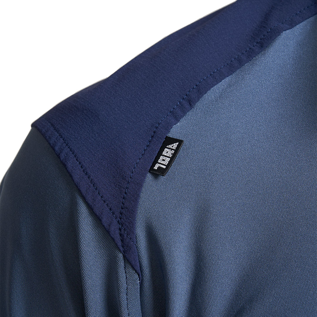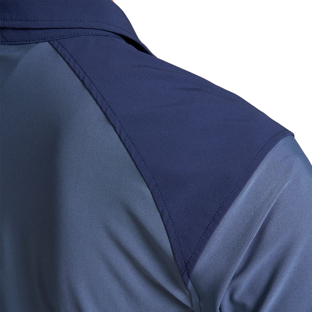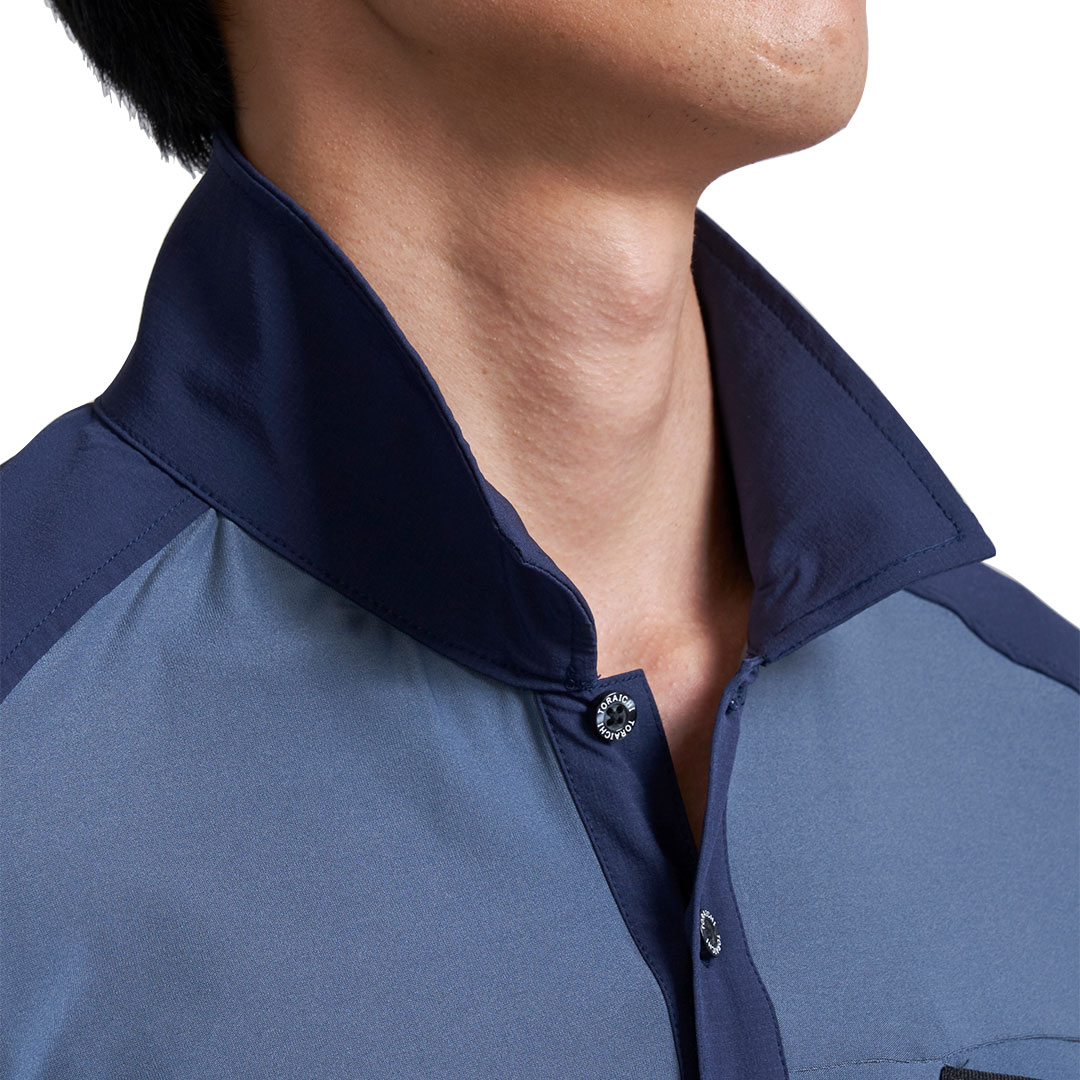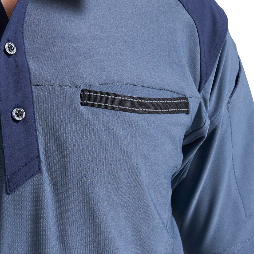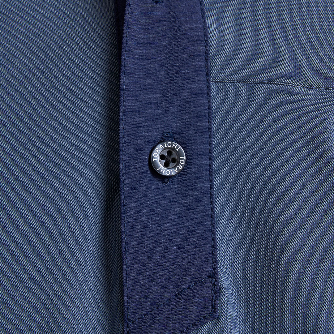 肩や衿に摩耗防止の布帛素材をプラスした半袖ポロシャツ。