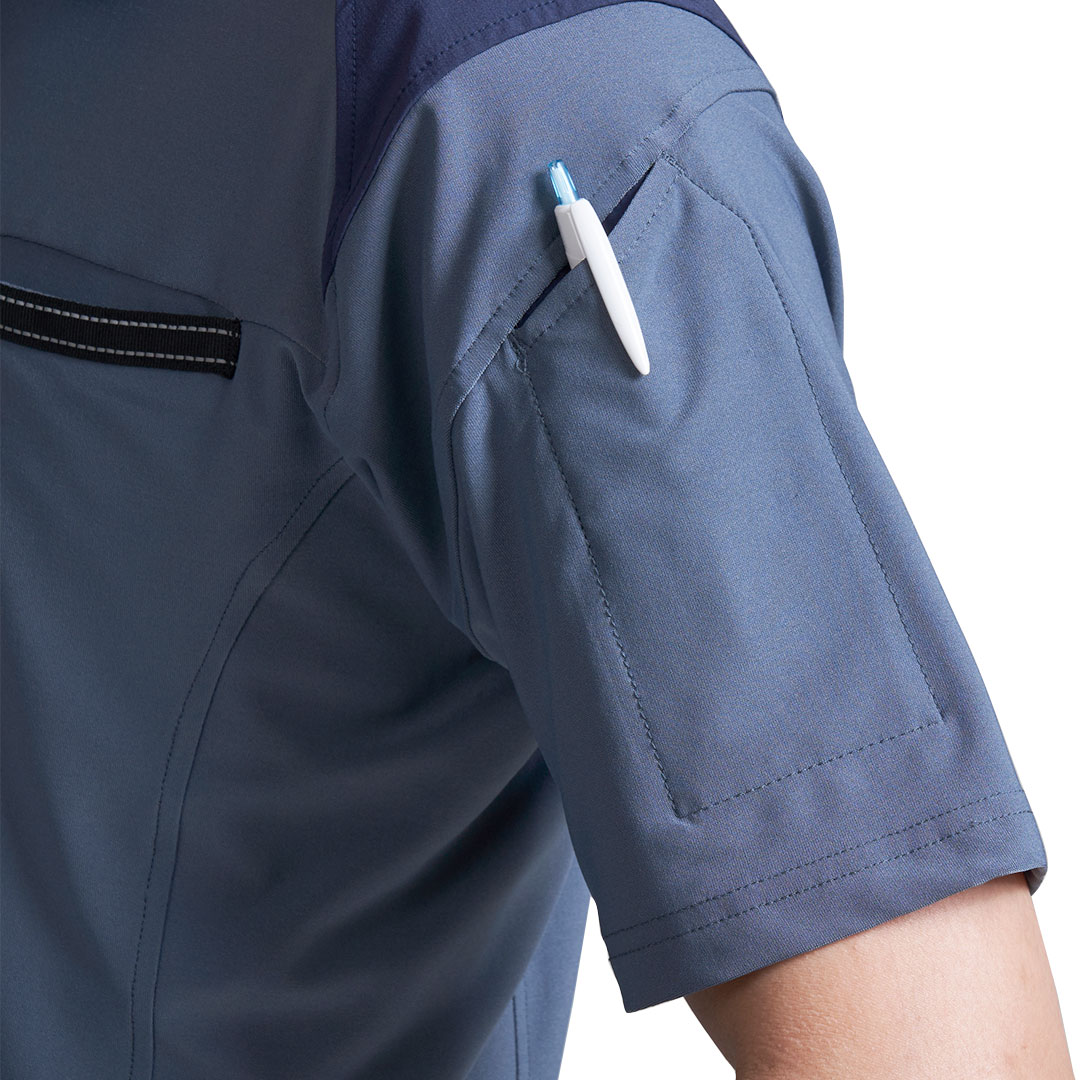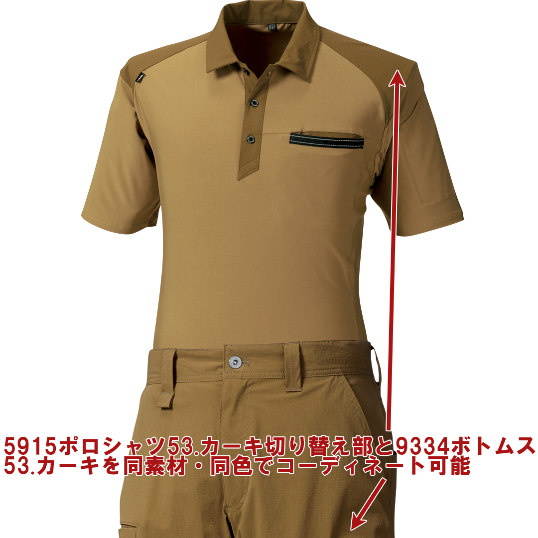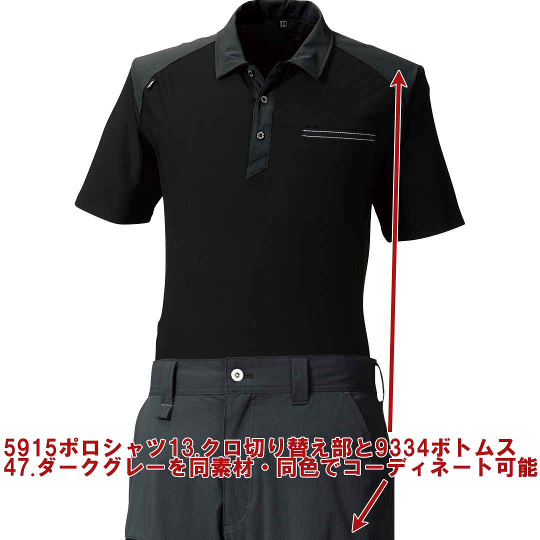 ポリウレタン5%混紡の伸縮性。薄手のさらっとした素材に肩や衿の切り替え素材がアクセント。9334シリーズのボトムスと組み合わせると統一感のあるコーディネートが楽しめるこの春夏注目の半袖ポロシャツです。