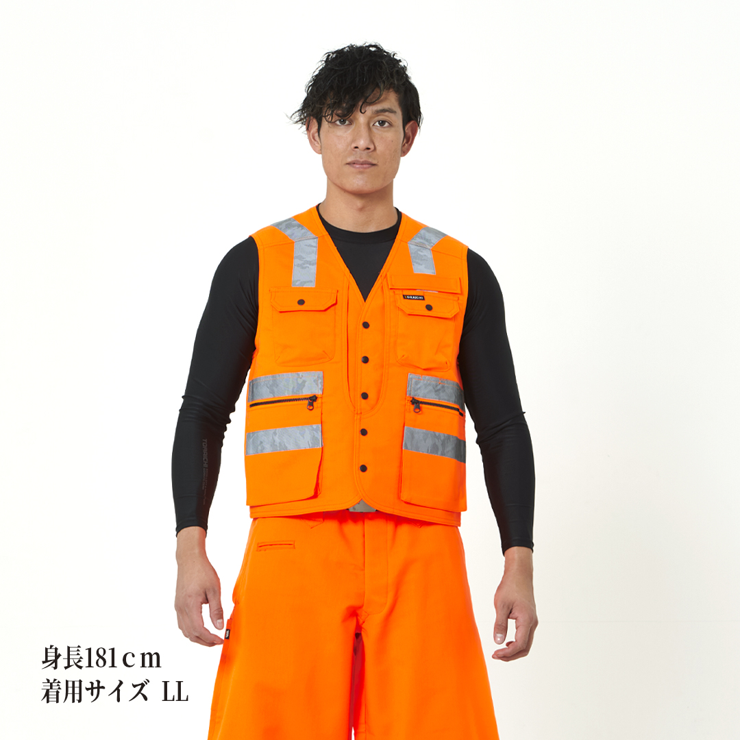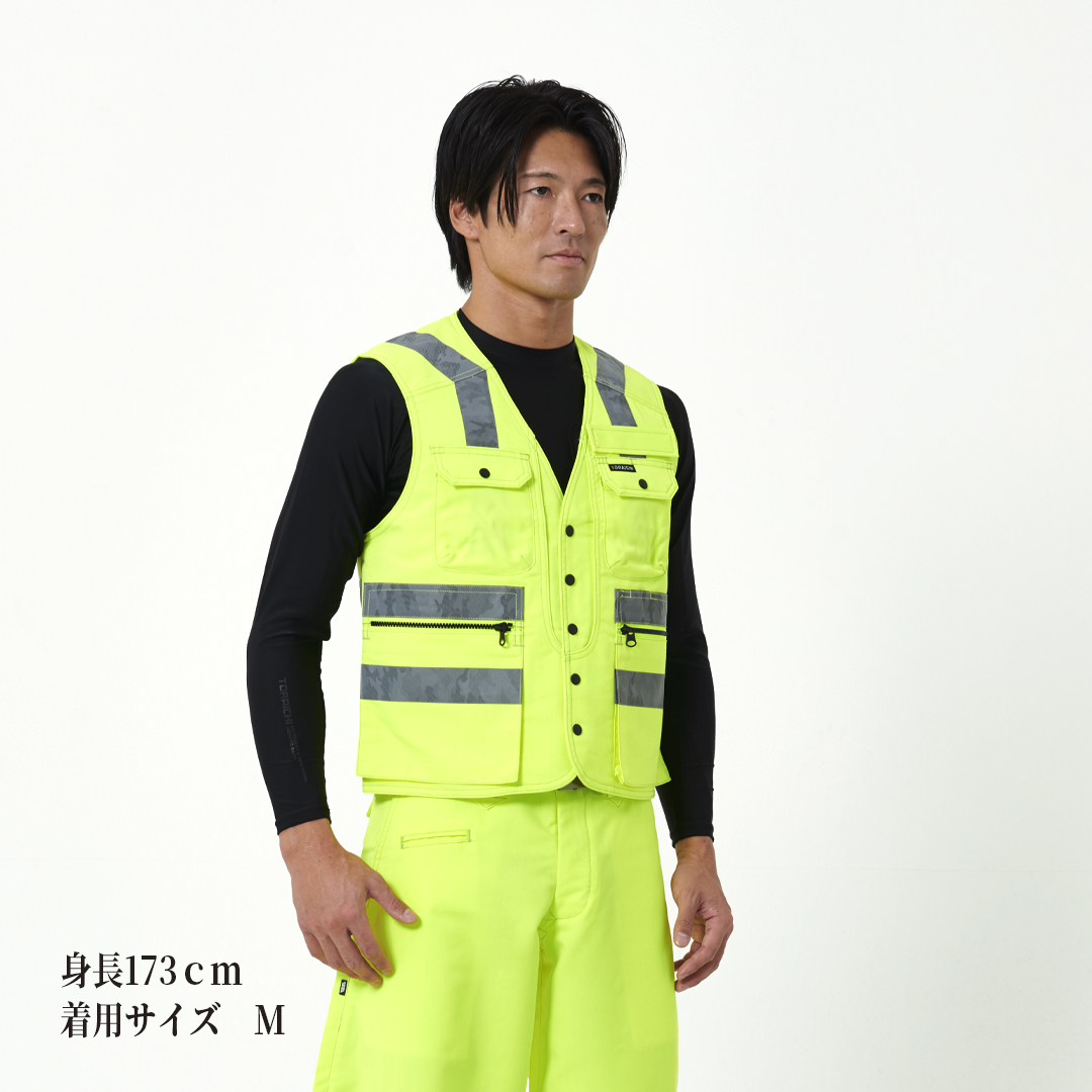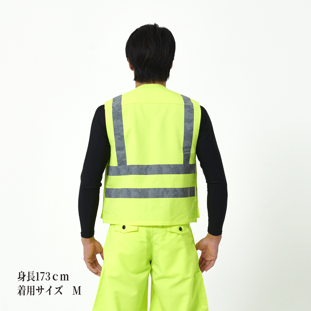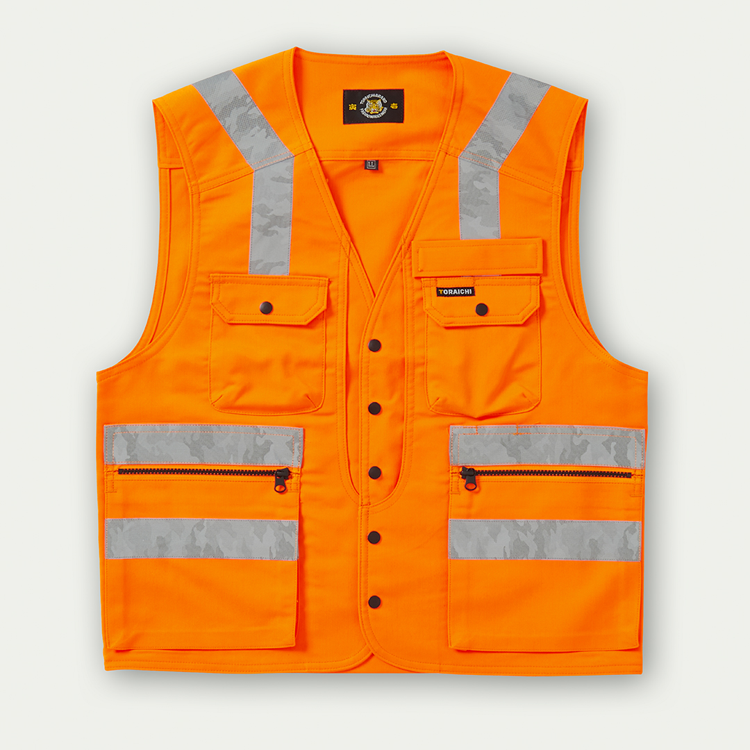 蛍光イエロー・蛍光オレンジという安全性の高い素材に迷彩反射材をプラス。安全性・デザイン性を兼備したアーミーベストが寅壱公式オンラインショップ限定で登場。