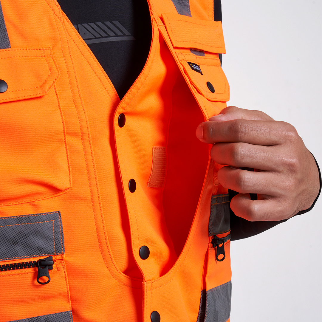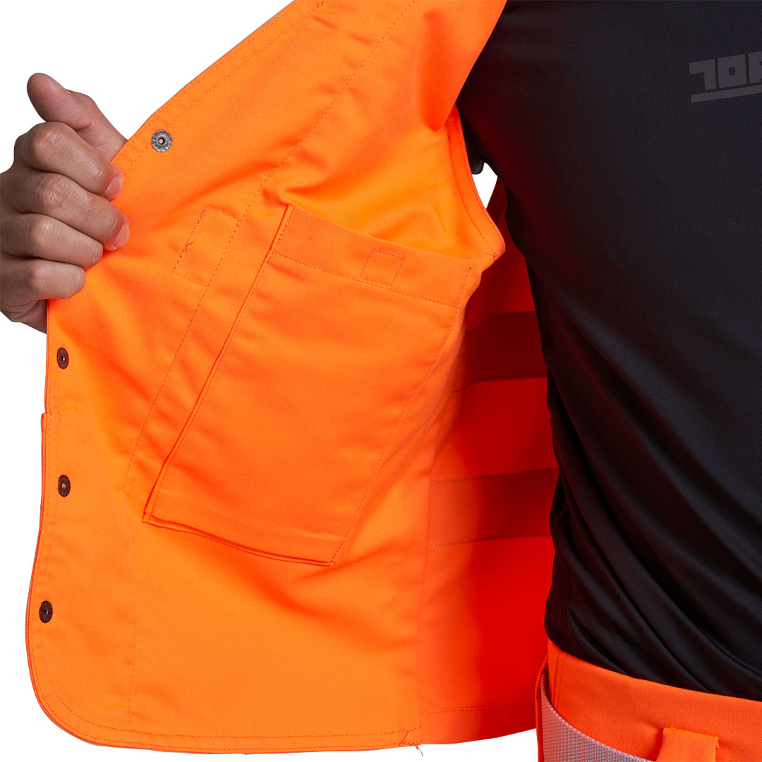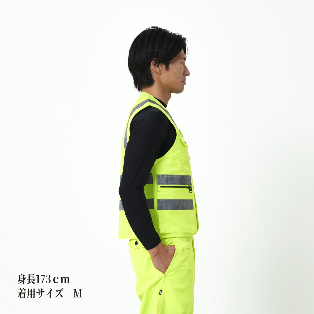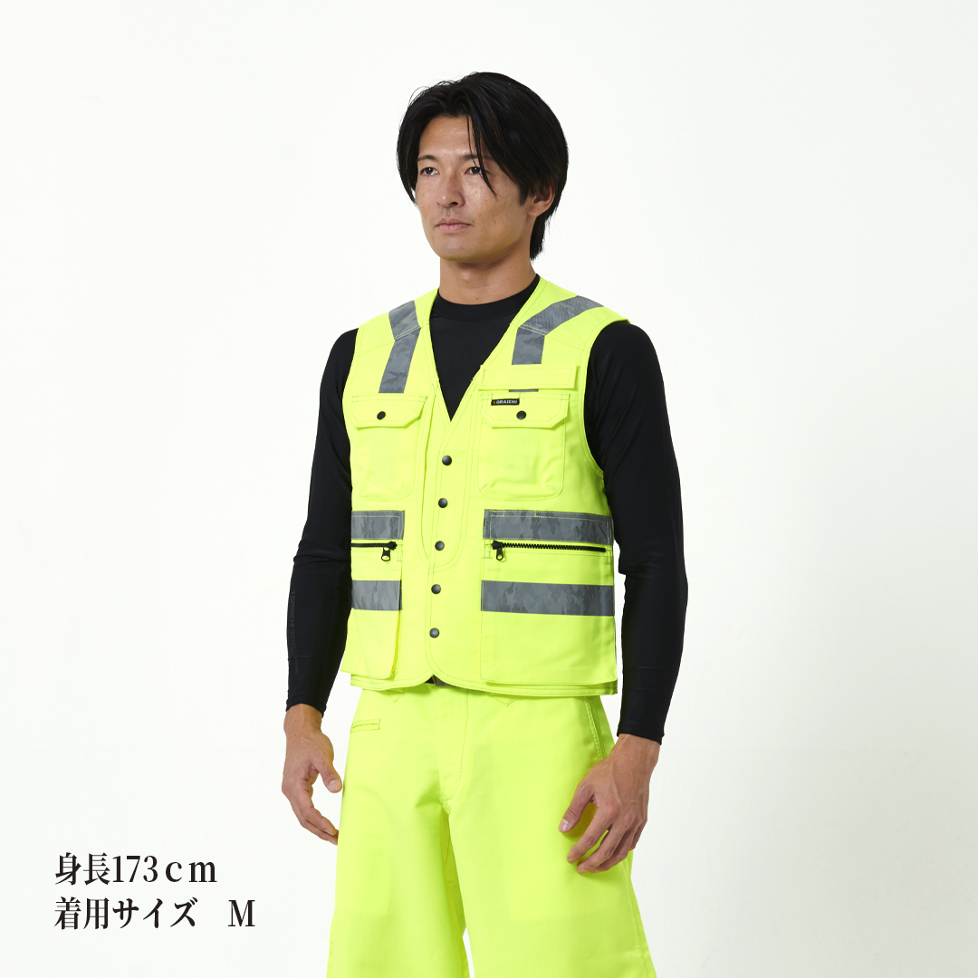 東レ製国内生地を用いた制電糸いりの蛍光素材。目立ち易く安全性に配慮した素材を全面に仕様しました。さらに遊び心のある迷彩柄反射素材とのマッチングにより、夜間のお仕事の強い味方となる逸品に仕上がりました。