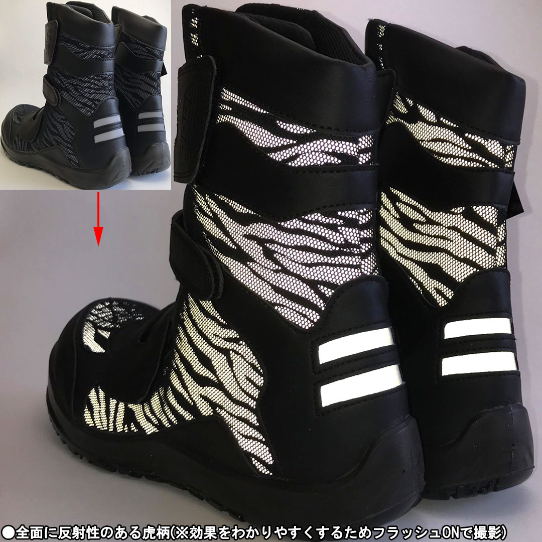 耐滑性の安心感と履き心地の良さ。全面に反射性のある素材を虎柄として配したこだわり。鋼鉄製先芯がさらに信頼度を向上させる長マジックタイプの逸品が新登場!!