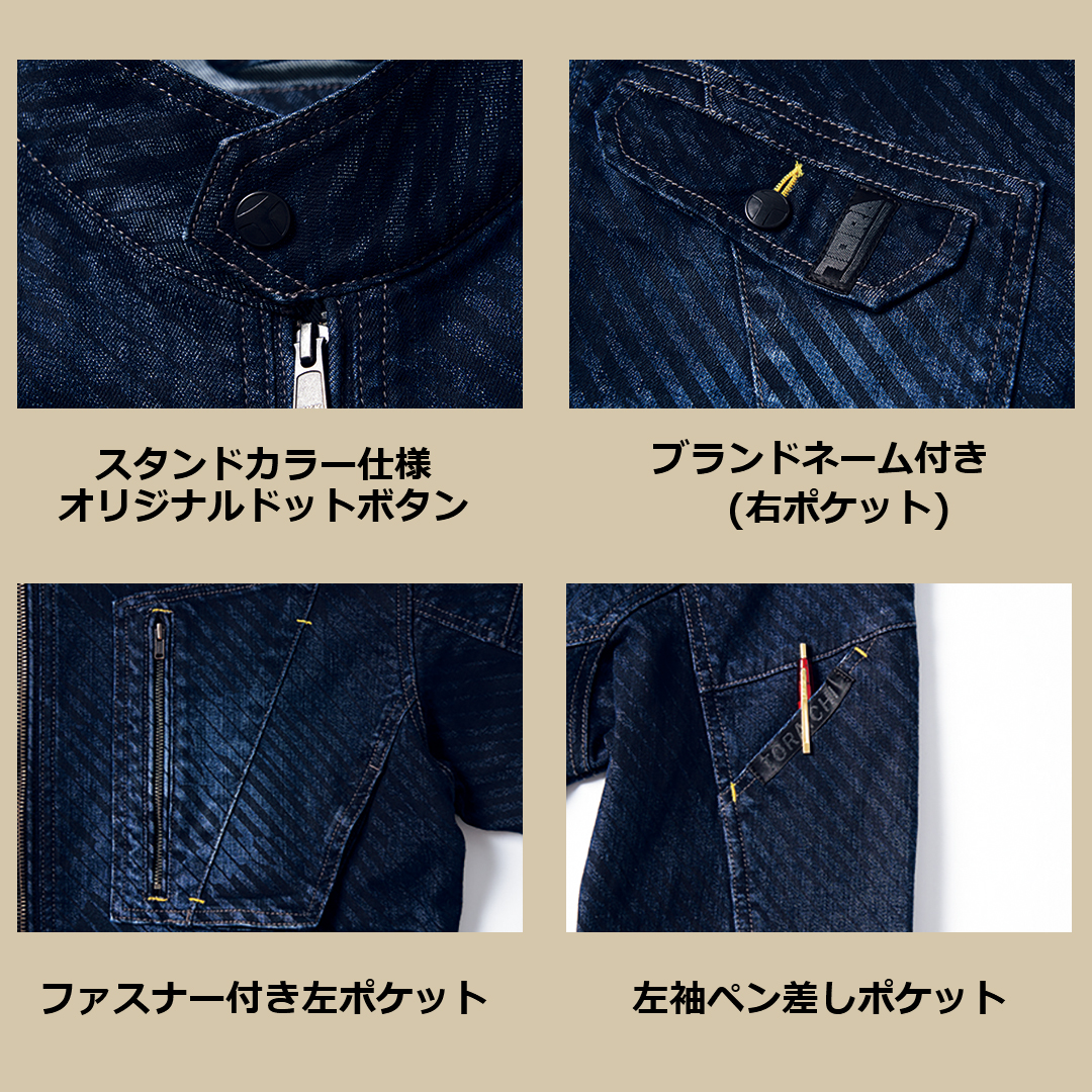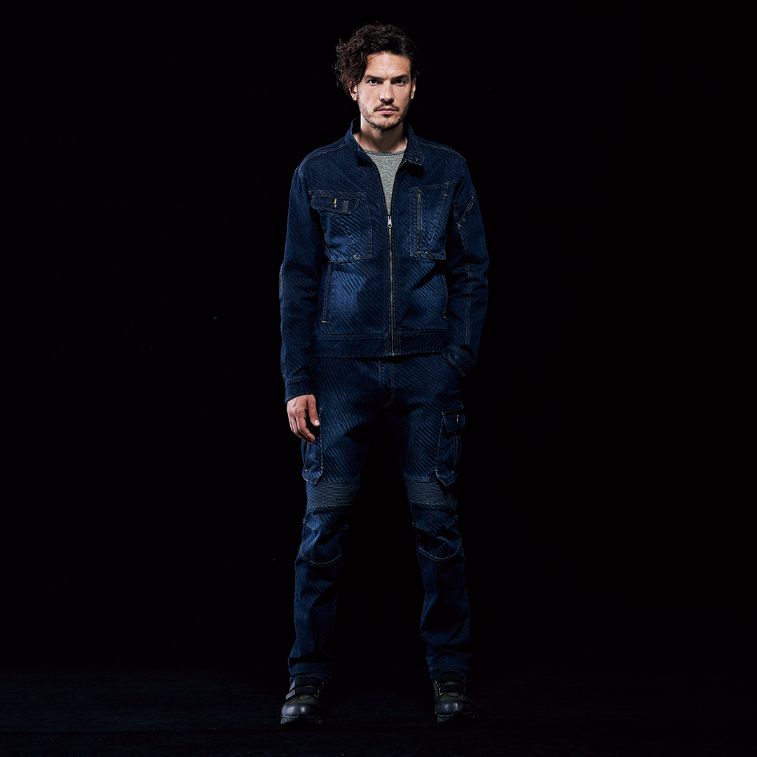 カジュアル感に加えて、動きやすさを実感できるストレッチデニム採用。優れた伸縮性と蛇腹プリーツで細身でも作業性アップ。着るほどに味わいを増すストライプカモ柄が個性的な一着。