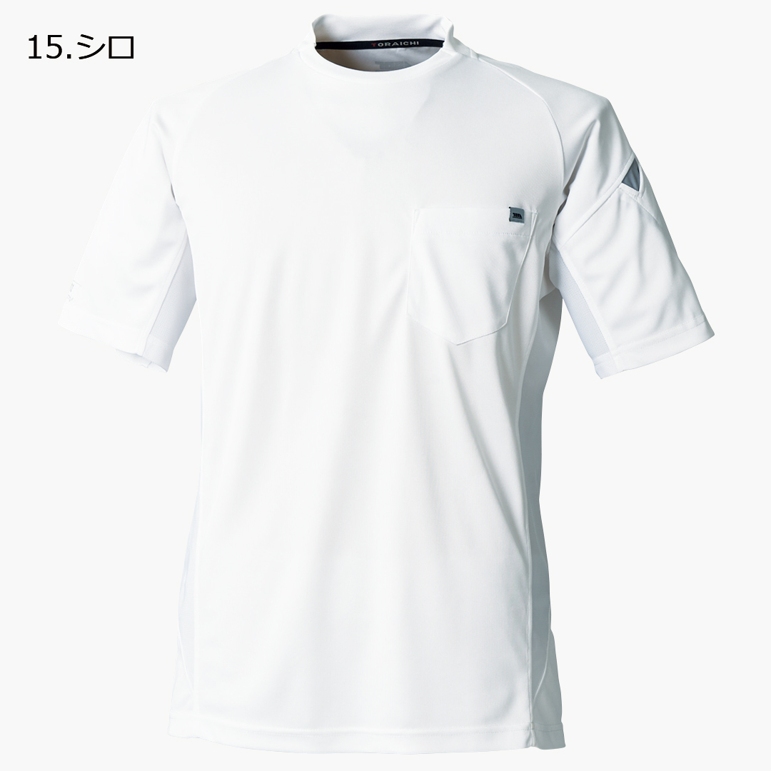 シンプルで着る人を選ばないデザイン。通気性のあるメッシュ素材で夏場も快適。ペン差しポケットの配色切り替えがアクセントの半袖クルーネックTシャツ。