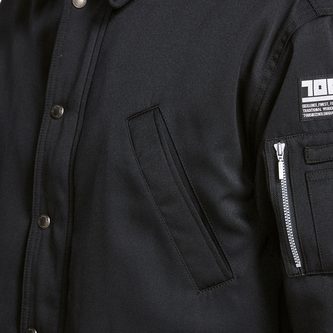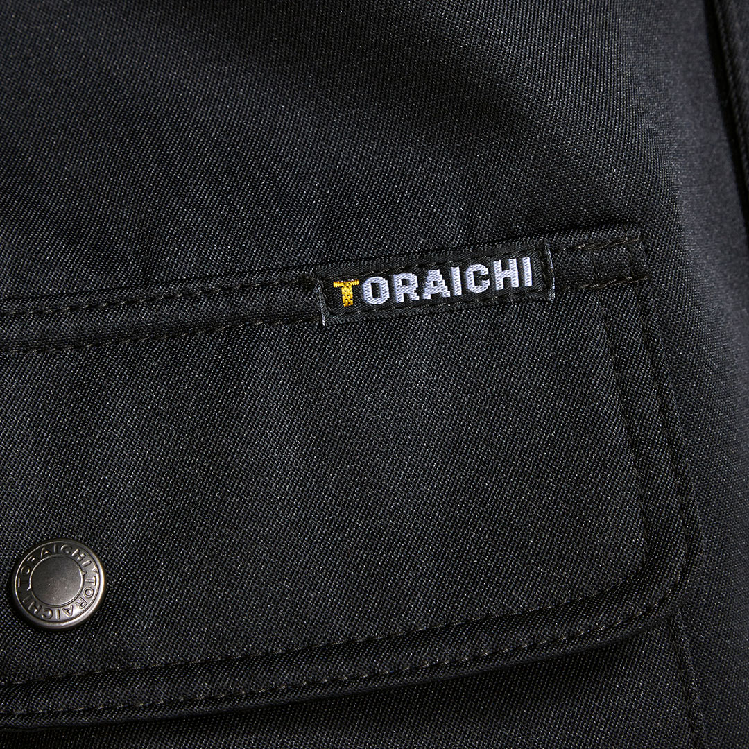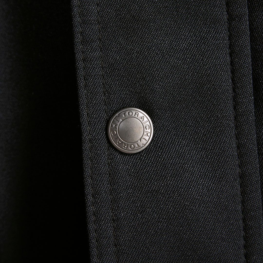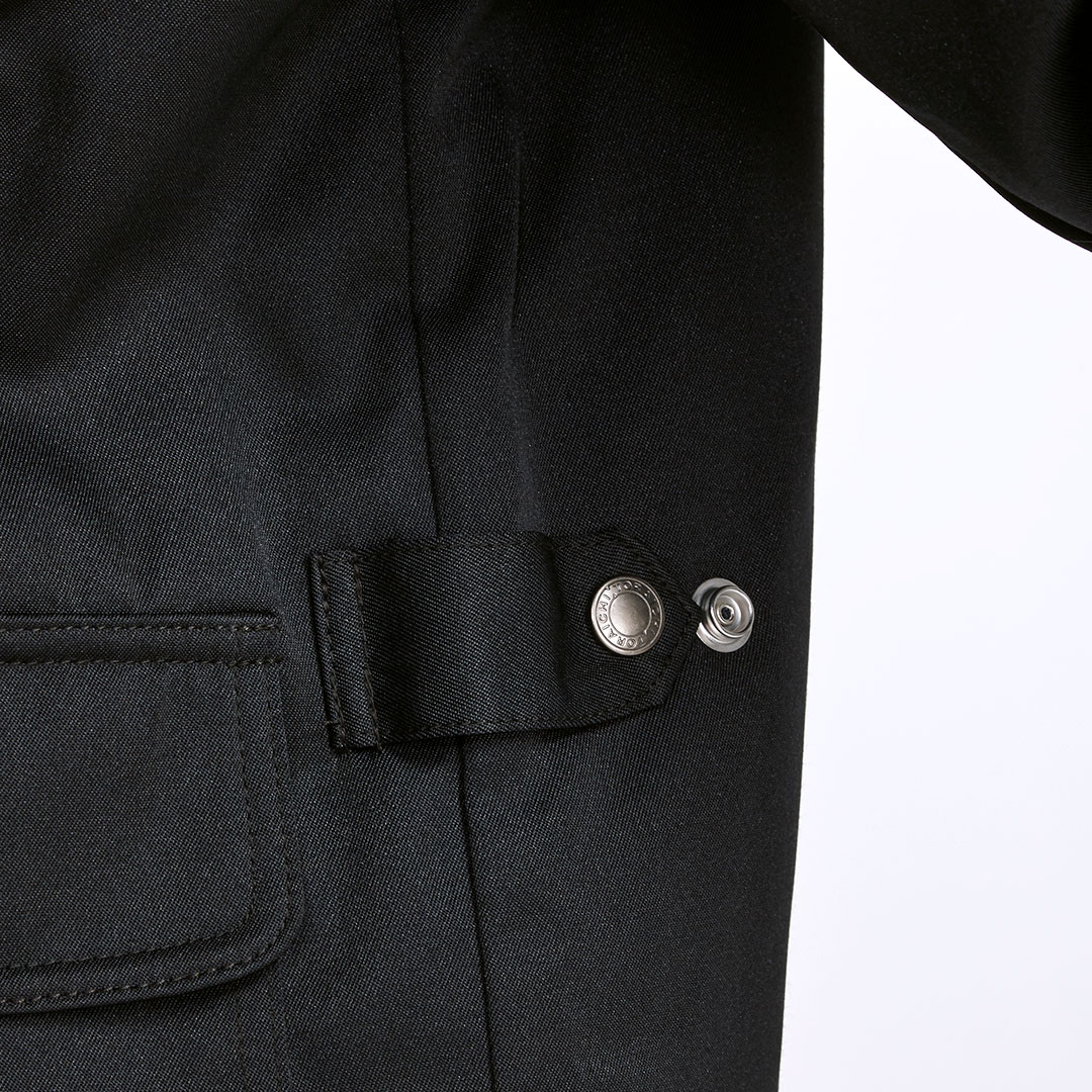 両脇の大きなドットボタン式ポケットや左胸斜めポケットなど収納力も抜群のハーフコートです。