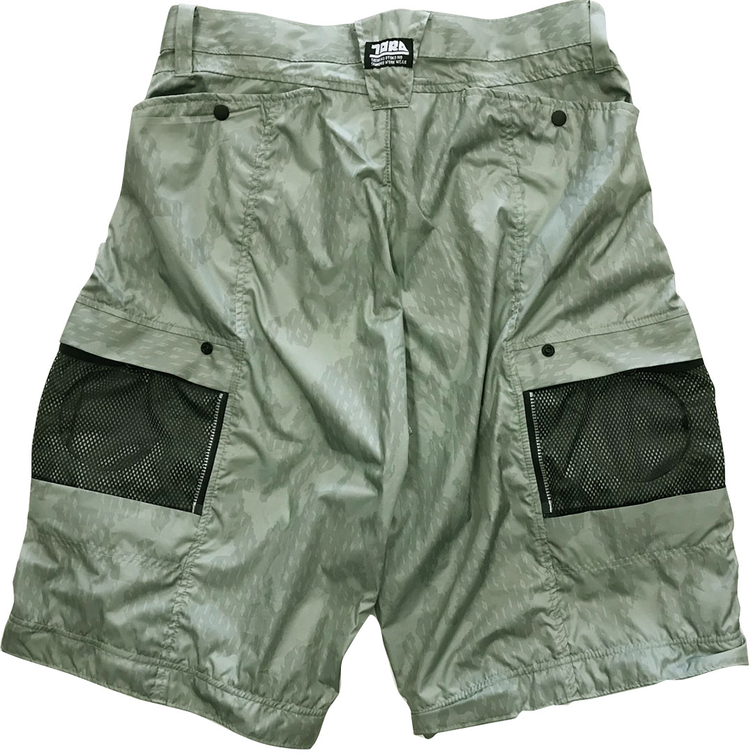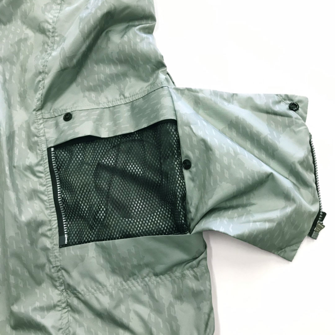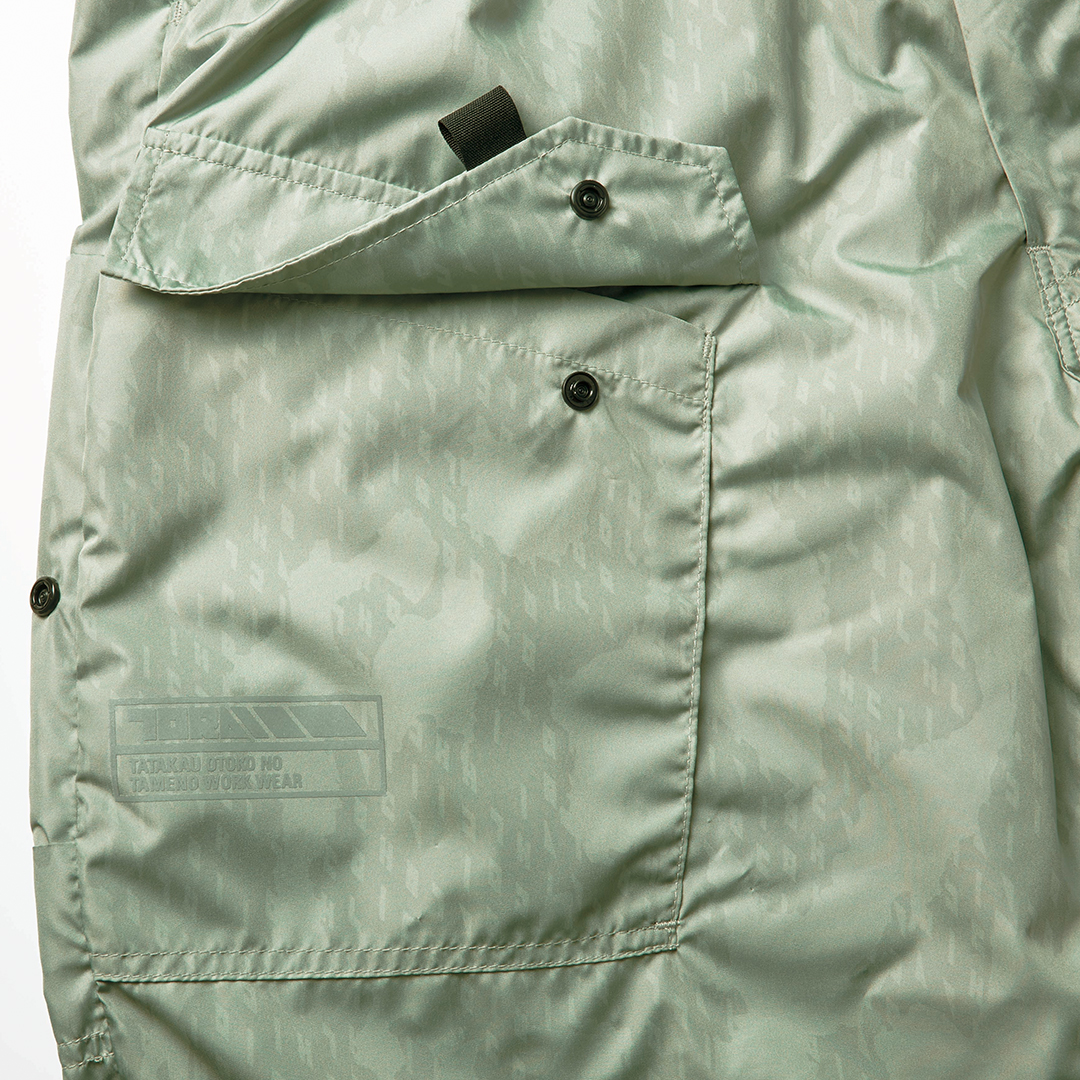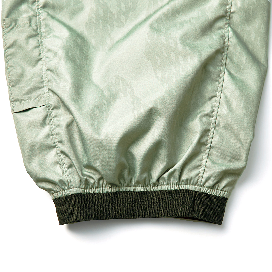 裏アルミコーティング加工で遮熱機能を有する軽量タフタを使用。裾ファスナー着脱により長ズボンタイプだけでなくハーフパンツとしての着用も可能。デュアルエアーパンツの名に相応しい仕様の逸品です。ポケット部分の再帰反射プリントやファン不使用時のカバー等ディテールにも拘りました。別売りのファン機器の使用により服の内側に空気の流れを作り汗の蒸発を促進して体感温度を調整します。酷暑に活躍間違いなしの逸品です。