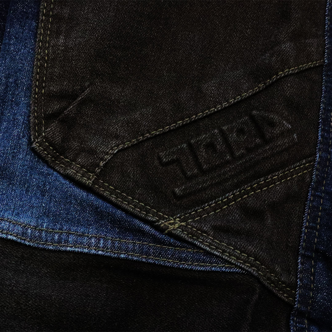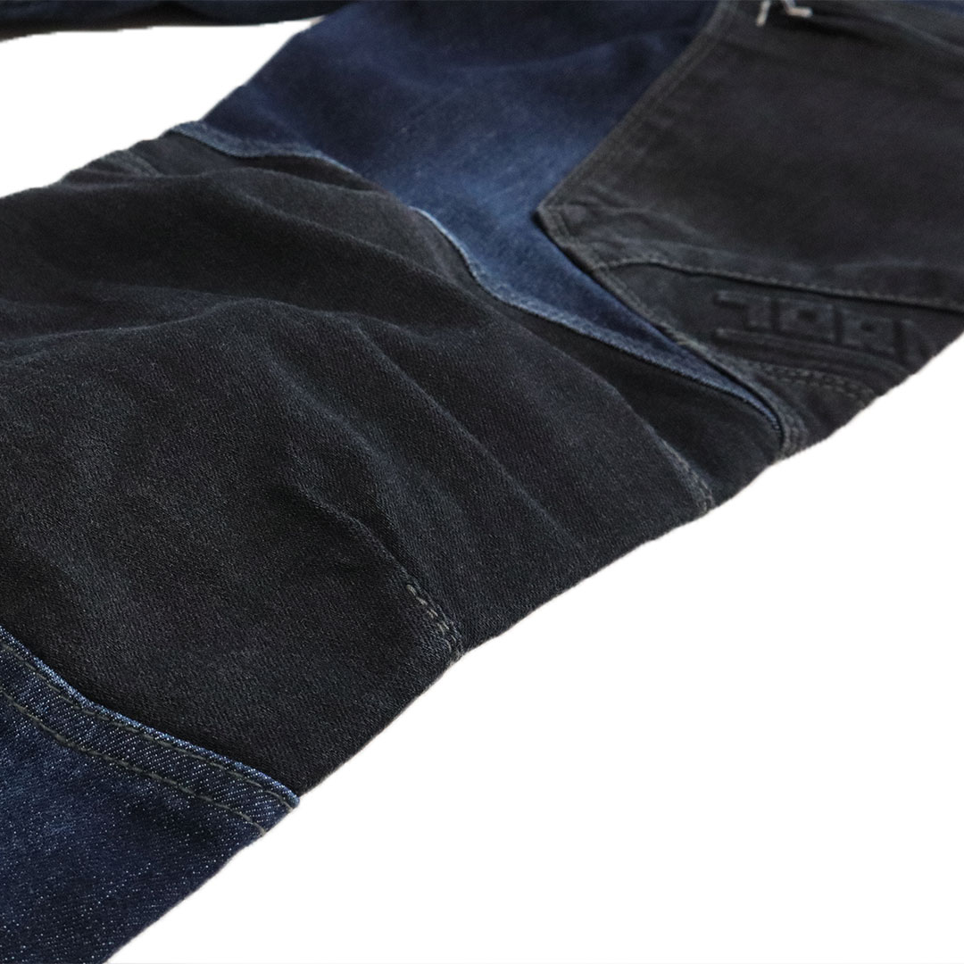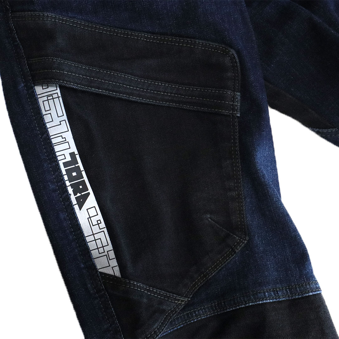 伸縮性の高いストレッチデニム【ラバーフレックス(R)】を取材に採用。さらに摩擦の発生が多い部分には黒のコーデュラ(R)を配し強度アップと切替デザインを生み出しました。