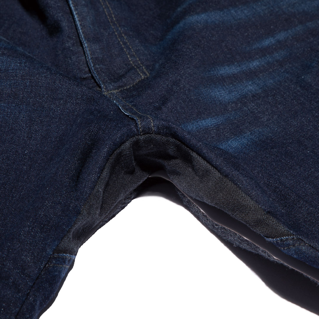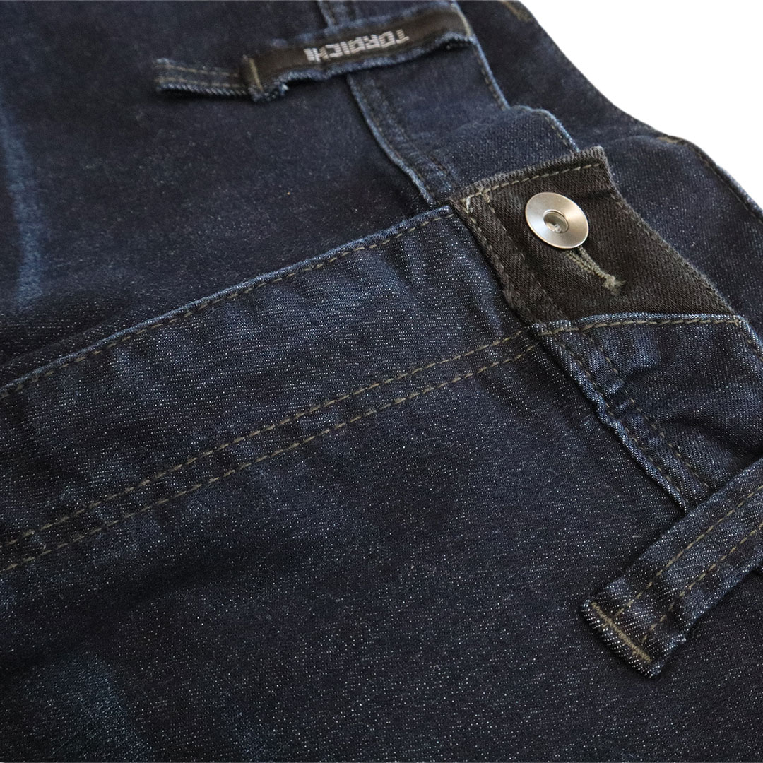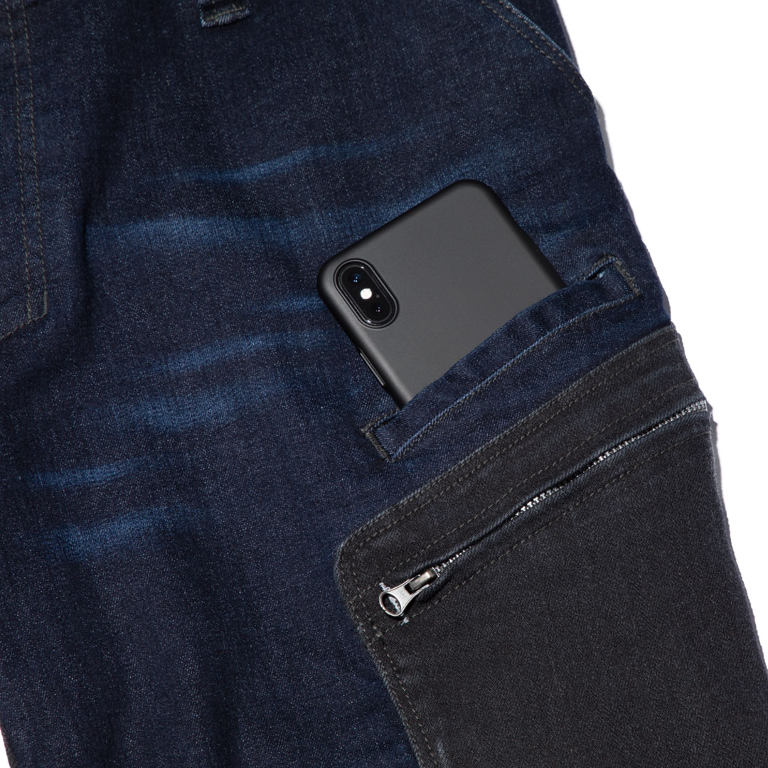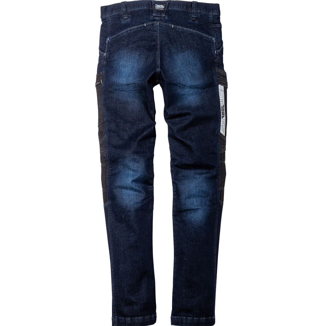 伸縮性の高いストレッチデニム【ラバーフレックス(R)】を取材に採用。さらに摩擦の発生が多い部分には黒のコーデュラ(R)を配し強度アップと切替デザインを生み出しました。