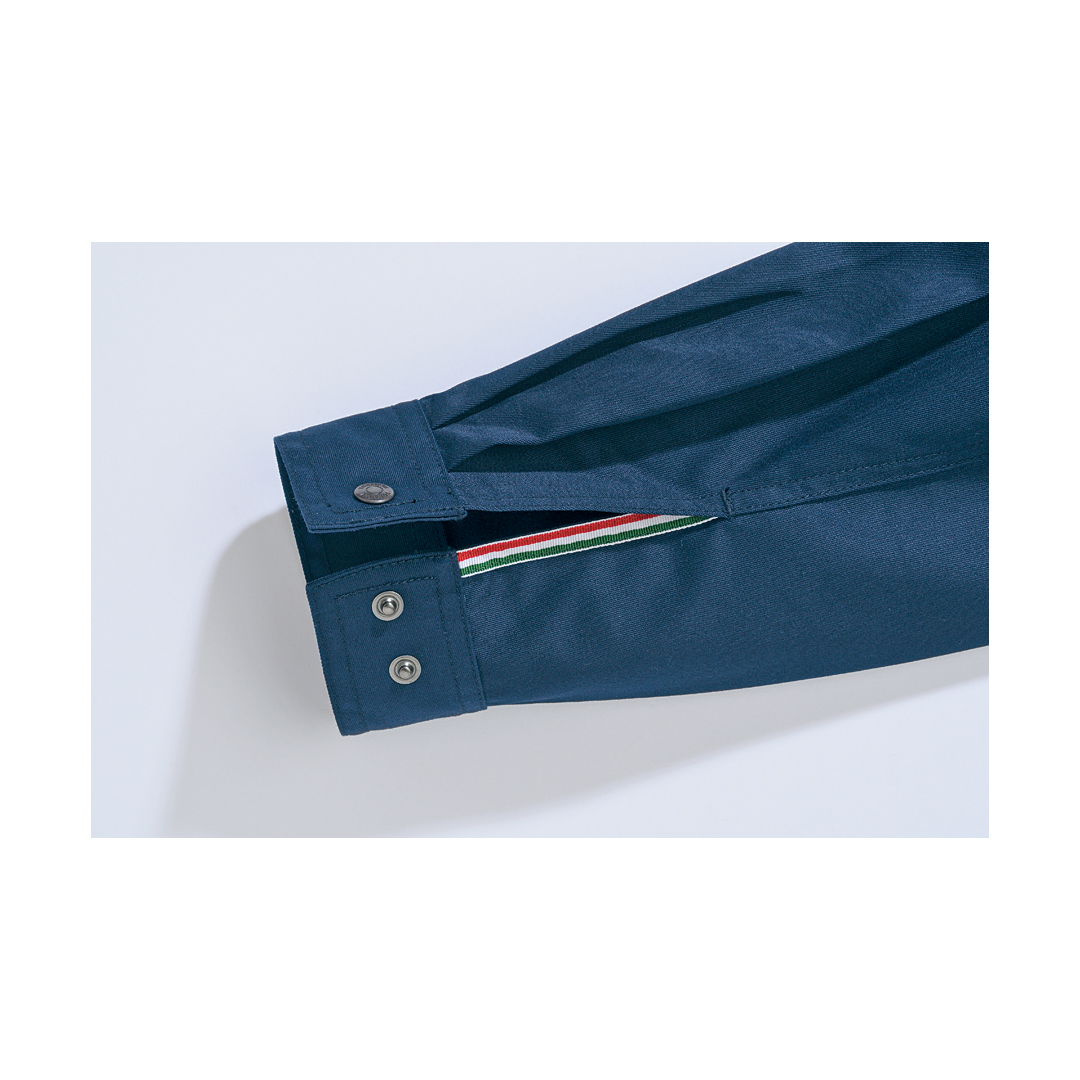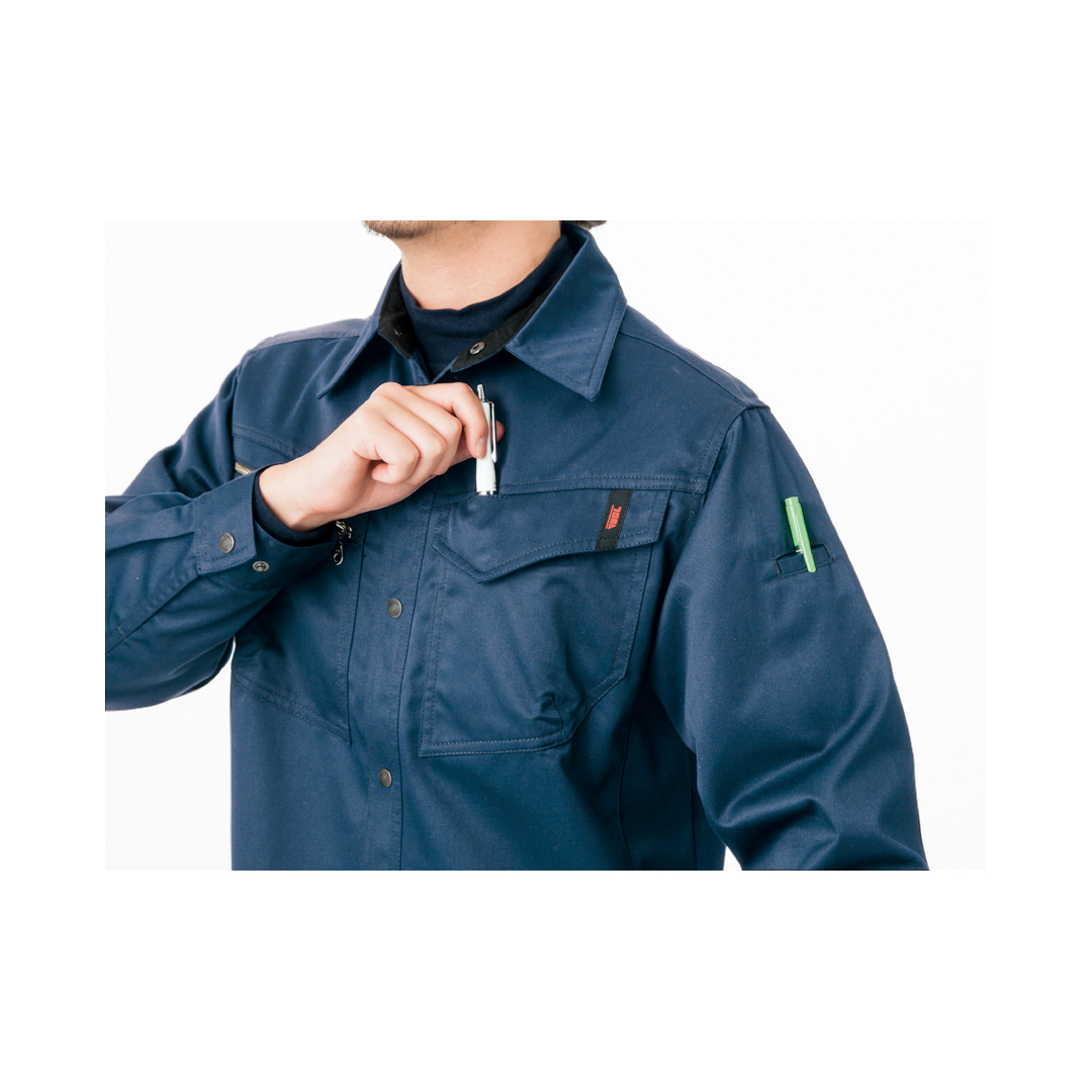 丈夫さ、イージーケア性のあるポリエステル・綿混紡素材。吸汗性や肌ざわりにも考慮したベーシックなデザインの長袖シャツです。