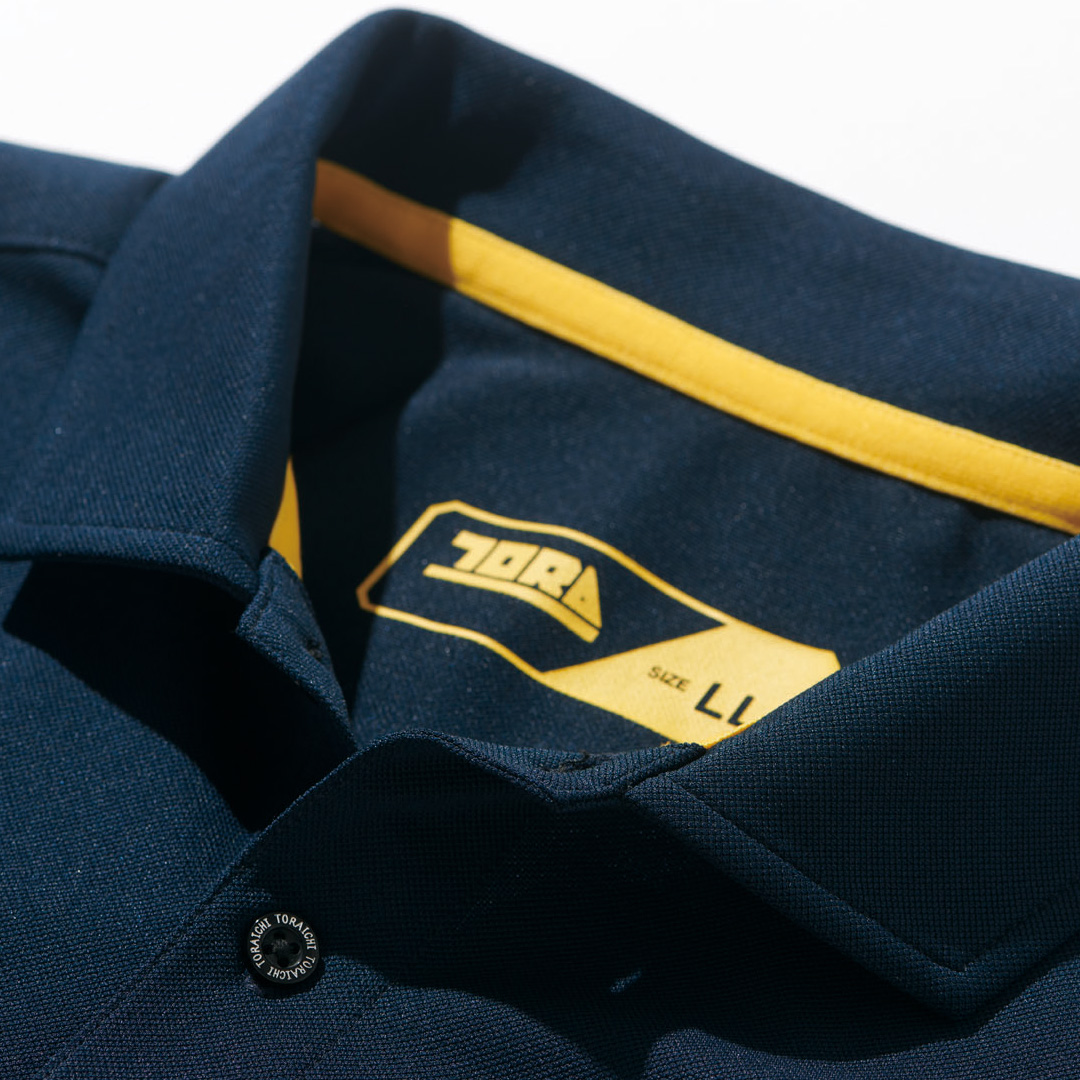 軽量吸汗ポリエステル鹿の子。立たせやすい衿仕様&ベーシックデザイン。イエロープリントも印象的な長袖ポロシャツ。