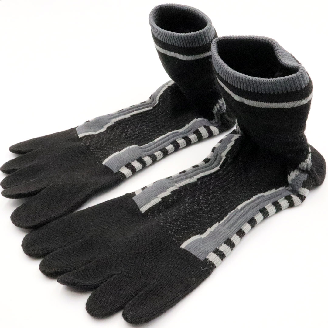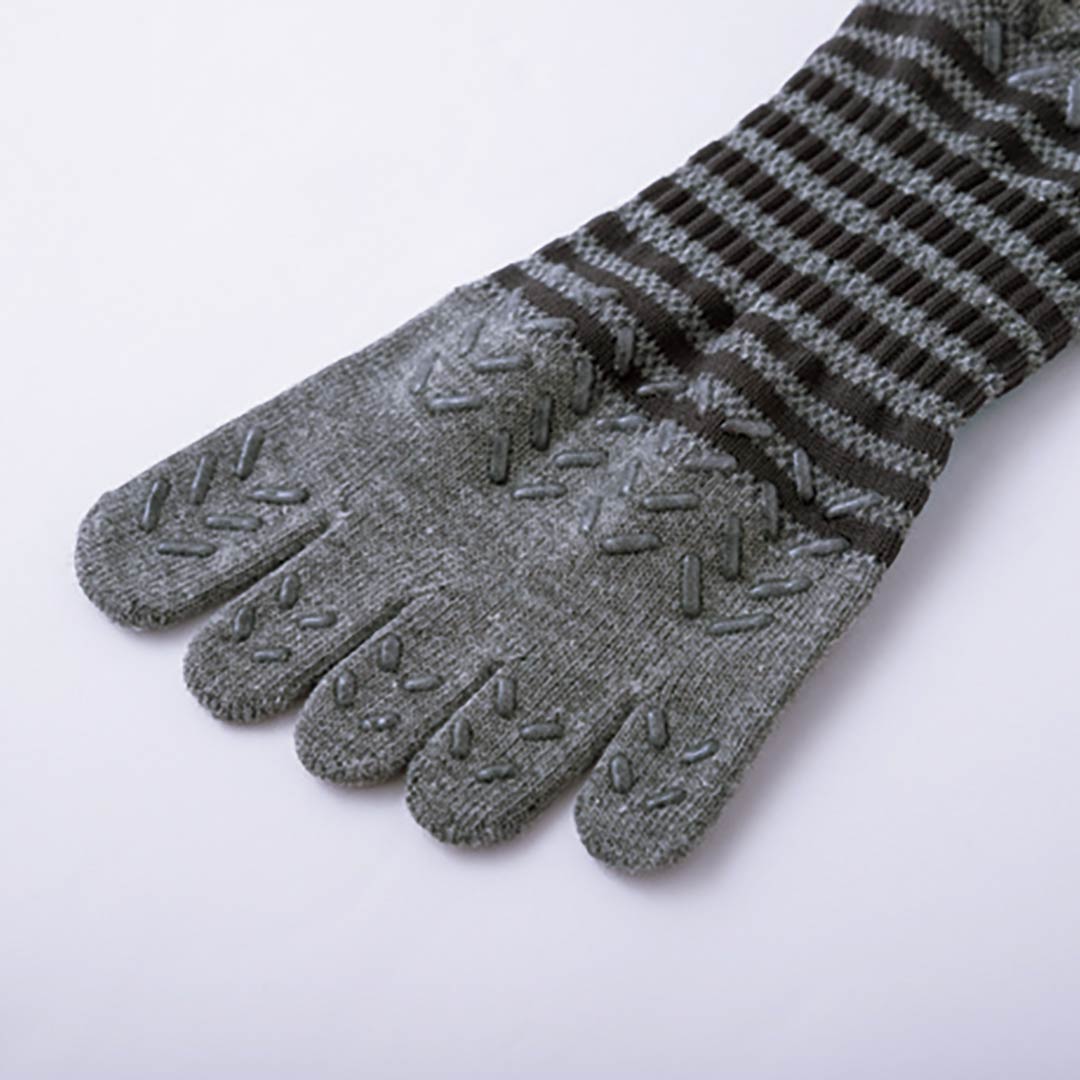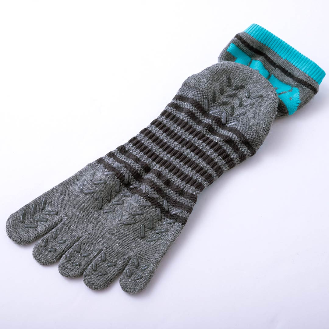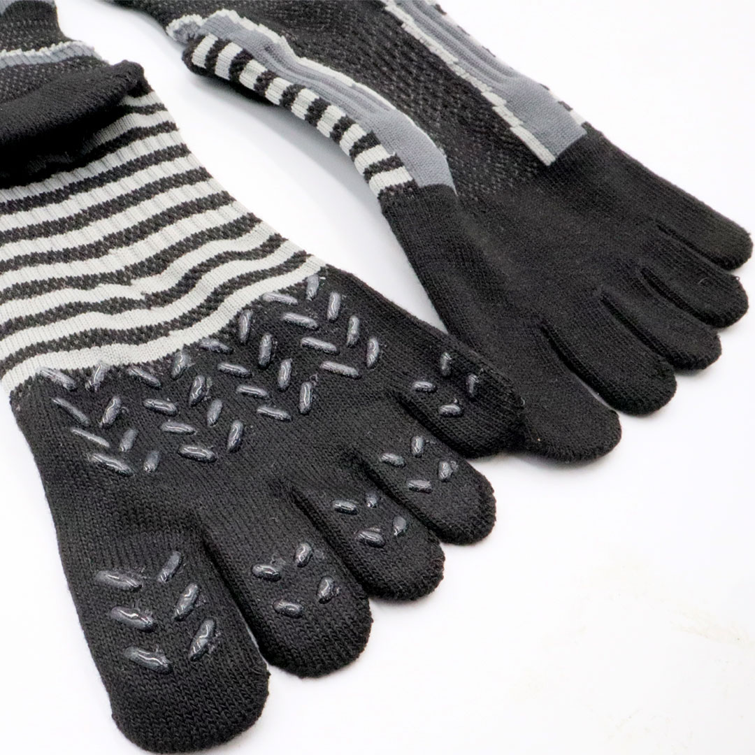 5本全ての指先まで施したシリコンプリント。幅広で靴の中で指先が滑りやすい状況でもしっかりとグリップ。ここ一番の踏ん張りがきくスグレモノです。