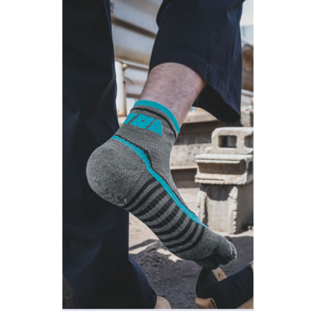 指先までのシリコン滑り止めで従来のソックスより強化されたグリップ力。甲部分と土踏まず部分のメッシュ編みにより群れを軽減し、安全・快適。パーツ別に機能を追求した寅壱の新作グリップソックス。