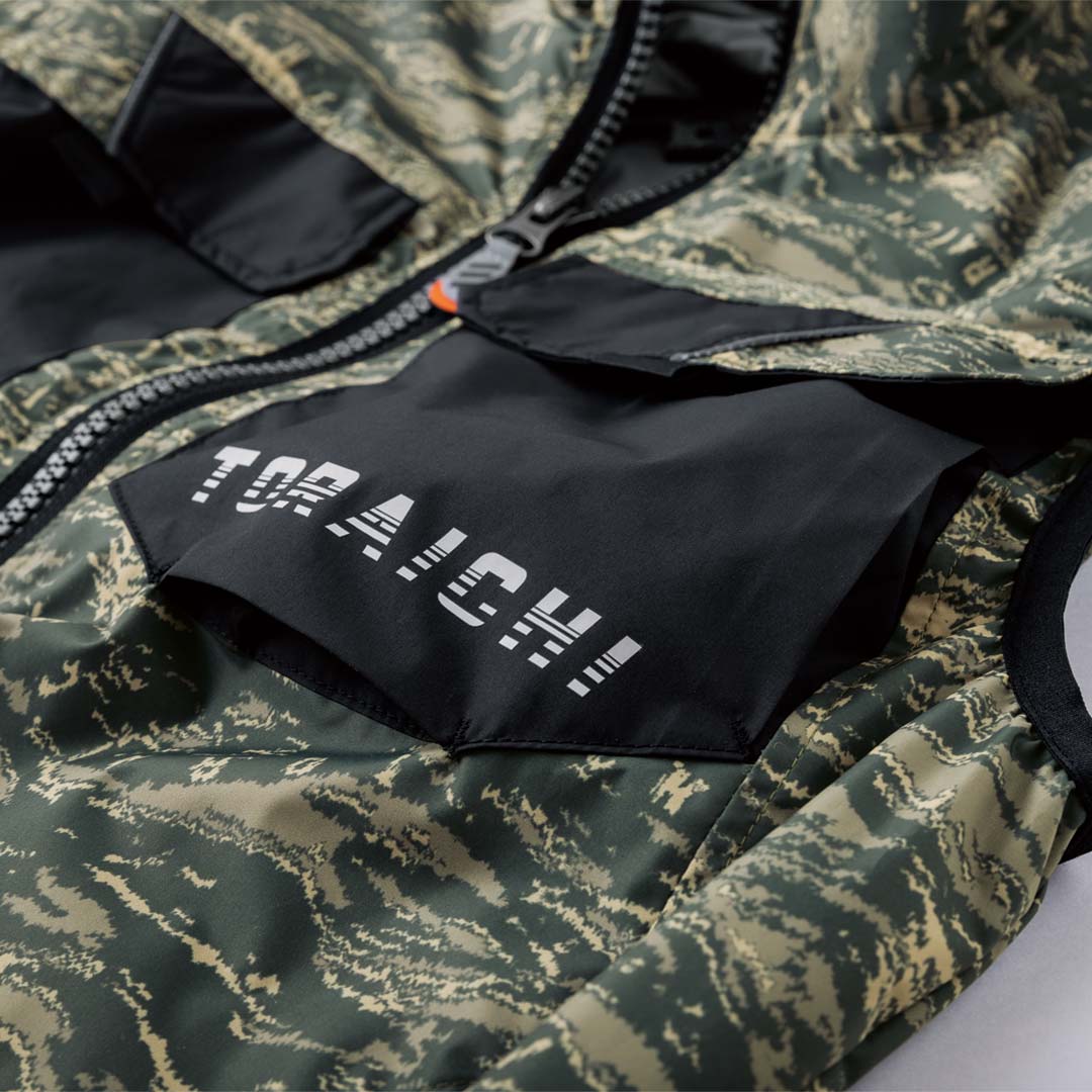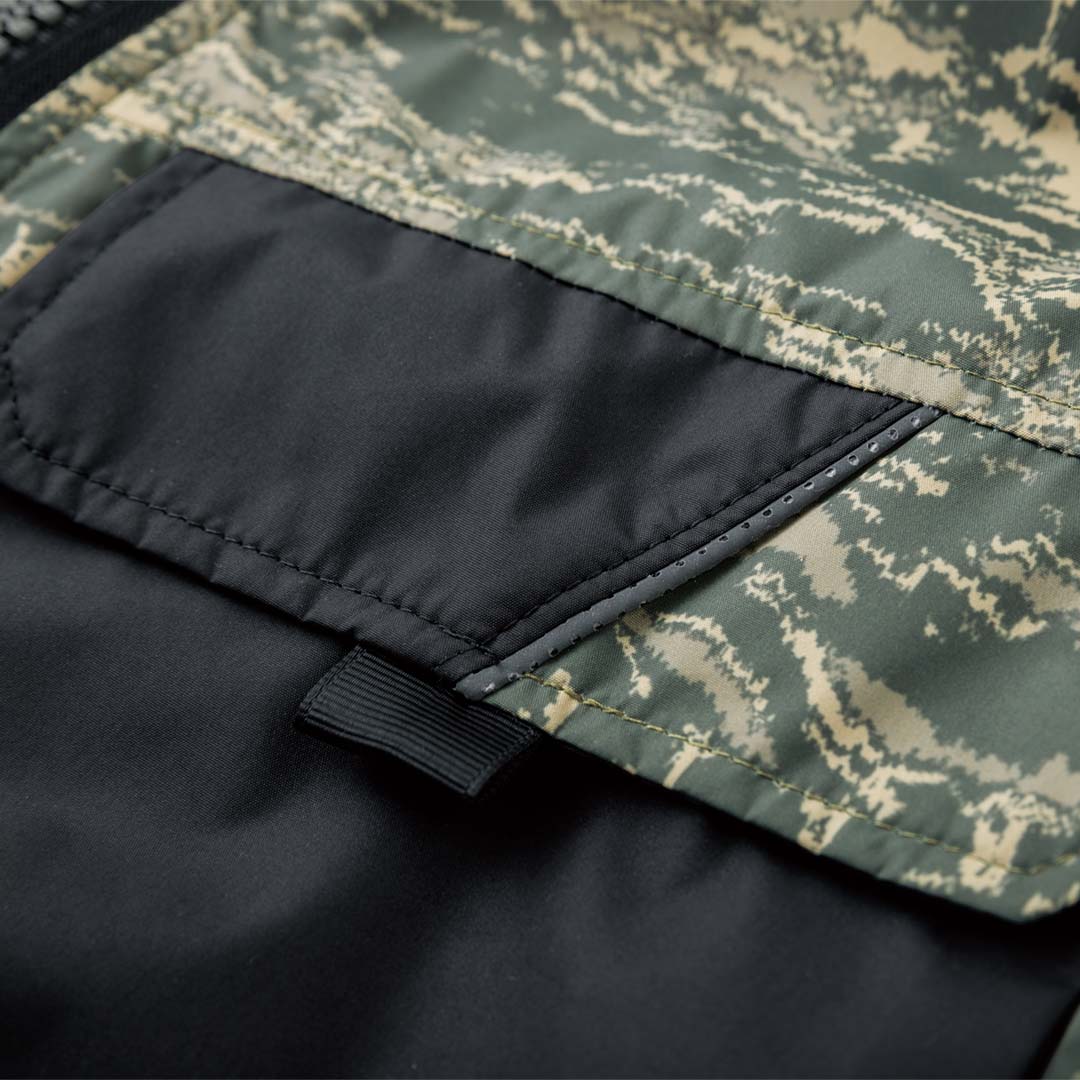 タイガーカモ柄と黒無地の生地を組み合わせたミリタリー系をポイントにしたデザイン