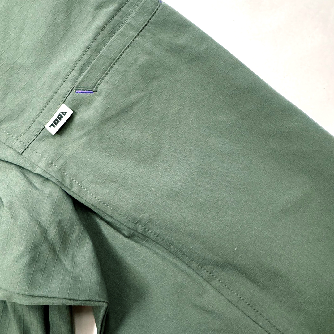 ポリウレタンを使用しない捲縮糸ストレッチ素材で、軽く薄手ながら耐久性を両立