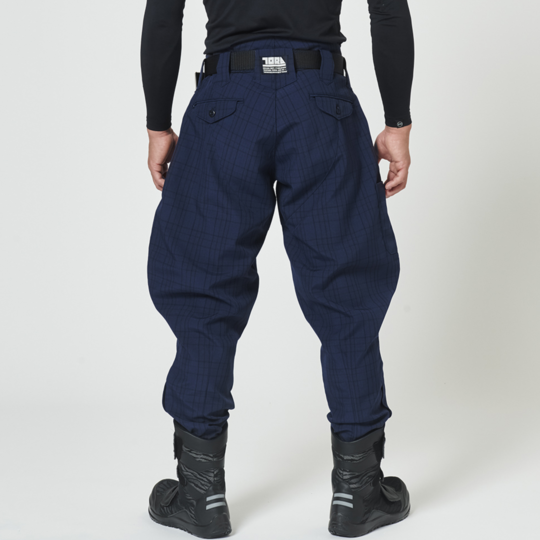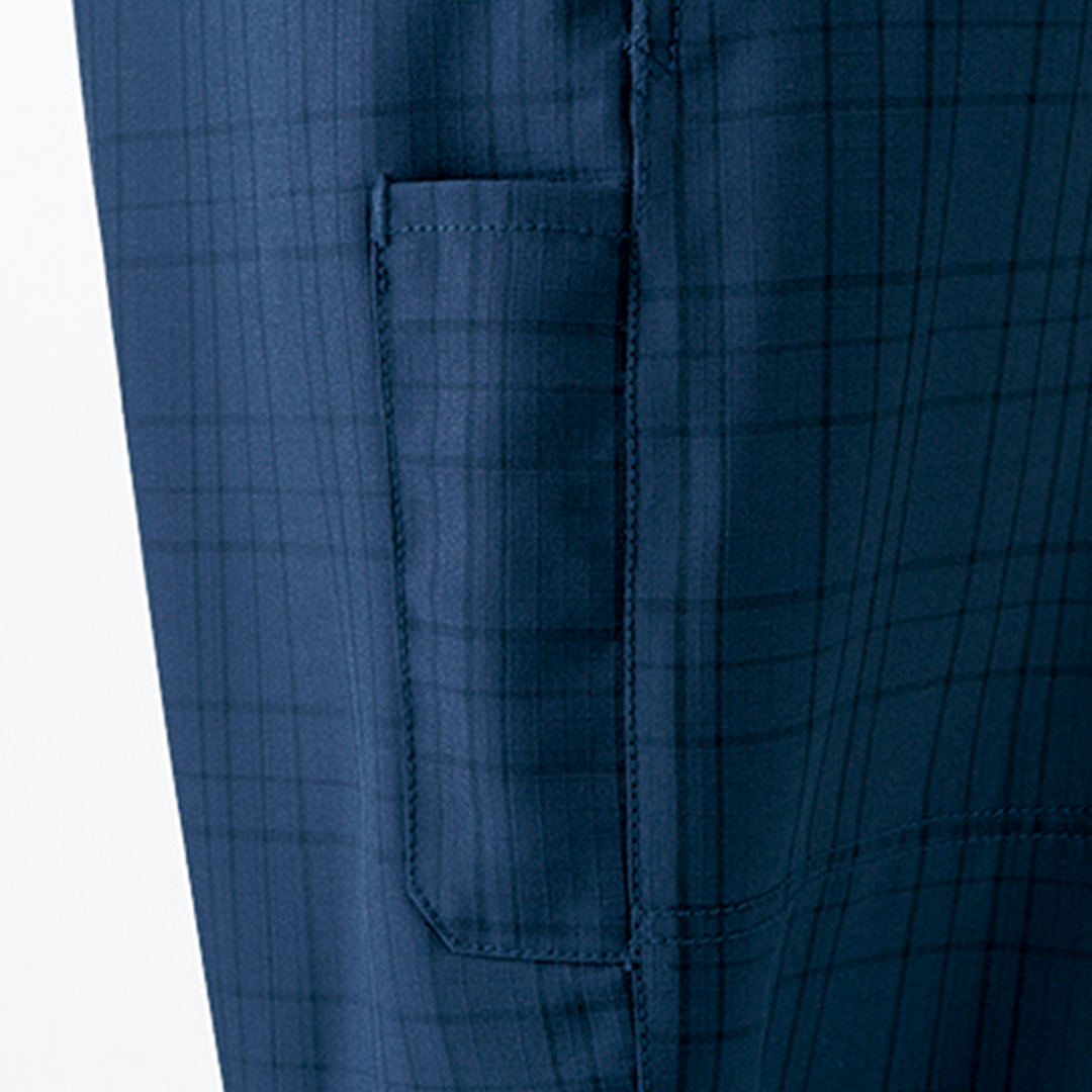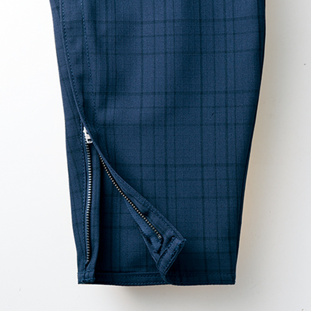 裾を絞った独自のスタイルはガッチリとした安全靴とも好相性。ダイナミックに動けて、つっぱる心配もありません。