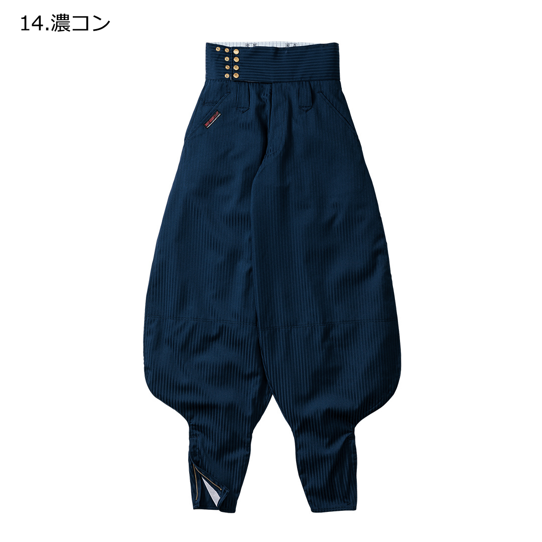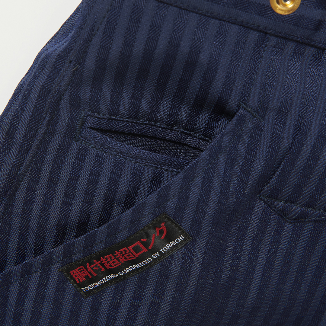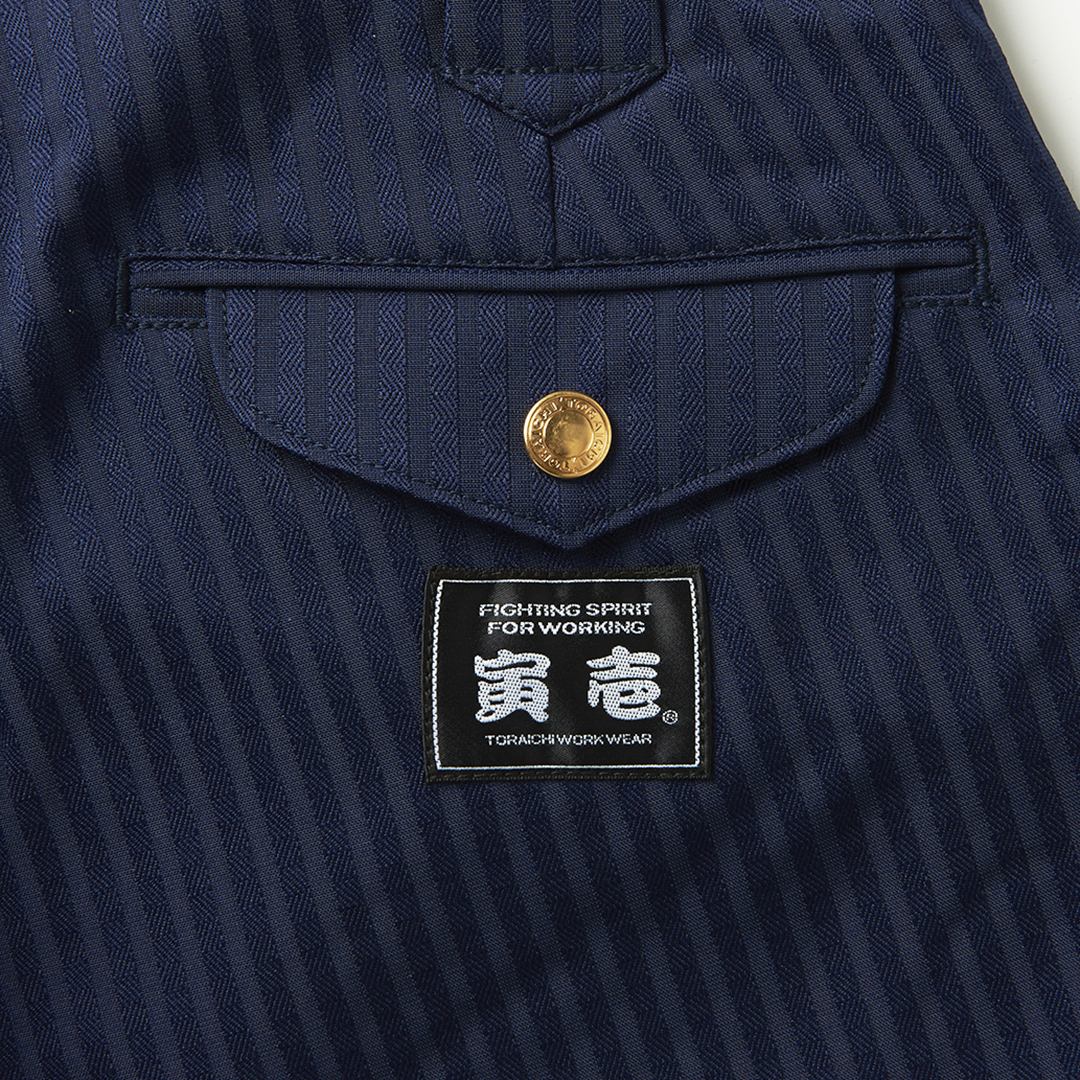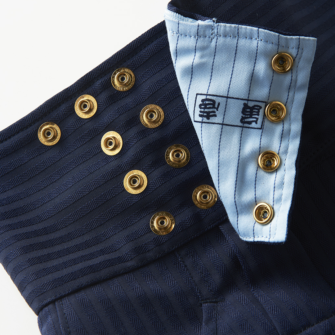 何といっても胴付きの厳つい印象、ゴールドボタンの独創性が魅力。プロが認める仕様も随所に見られ、本物志向に応える一着と言えるでしょう。素材は、存在感を感じさせる昼夜織り。