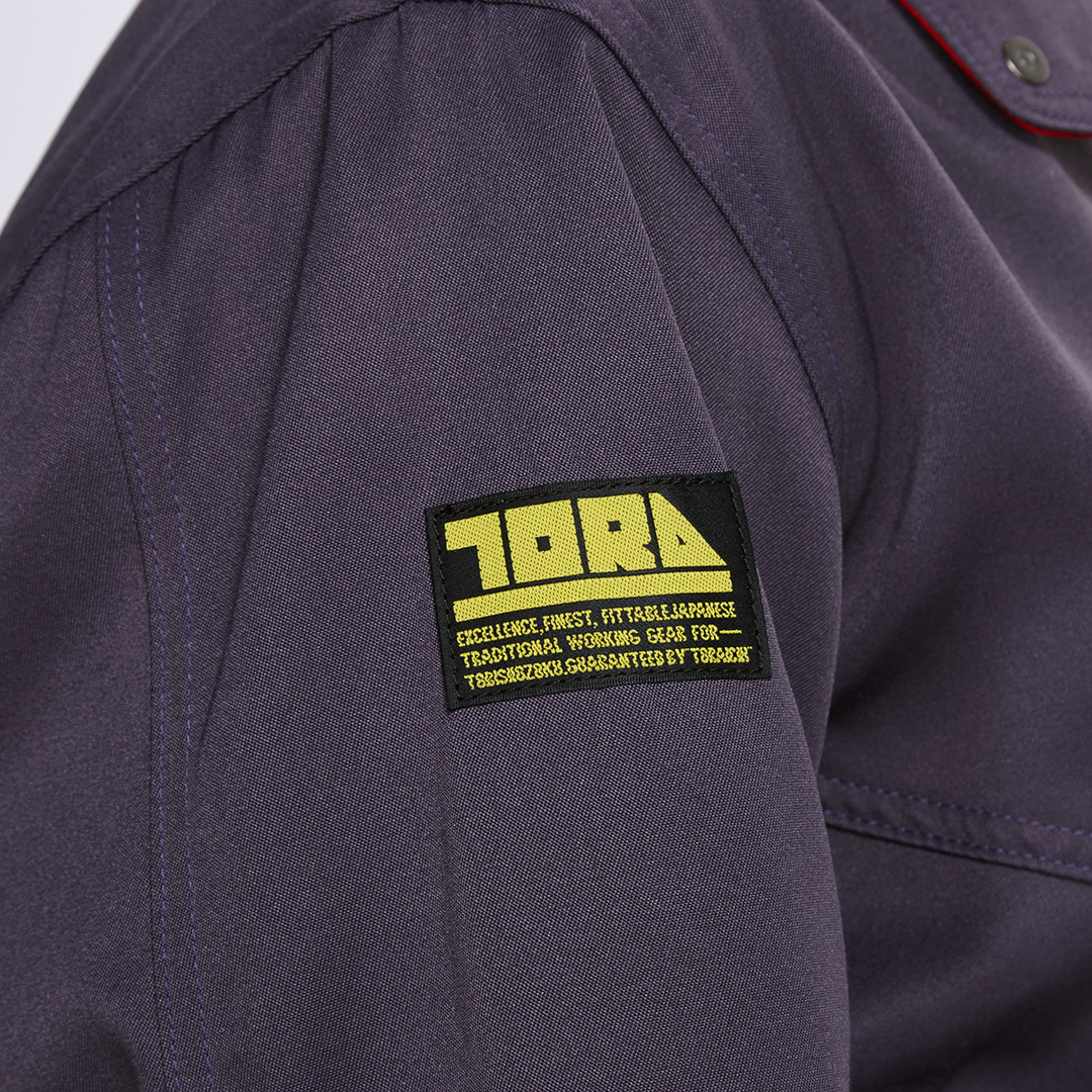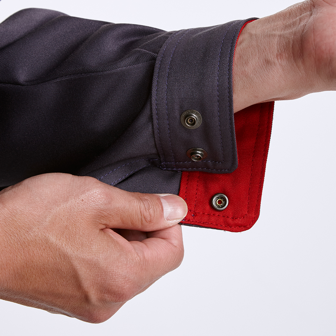 ウィング衿のシンプルスタイルに、意表をつく真っ赤な裏地がポイント。