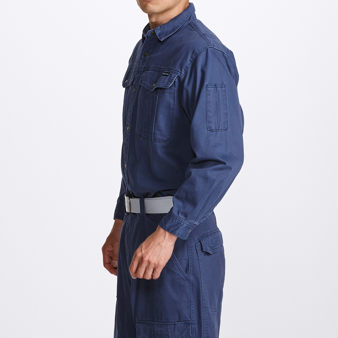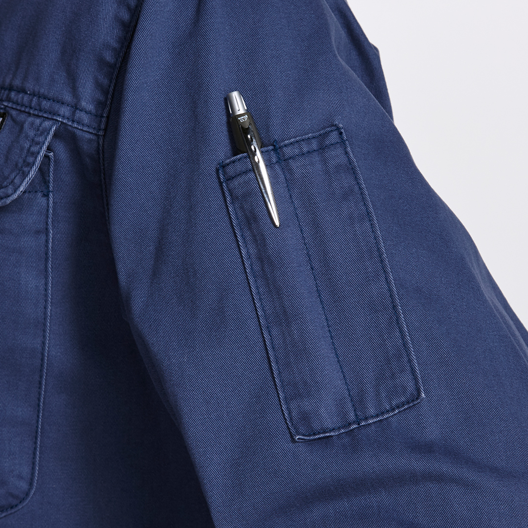 大きな雨ブタ付の胸ポケットに袖ペン差し仕様。