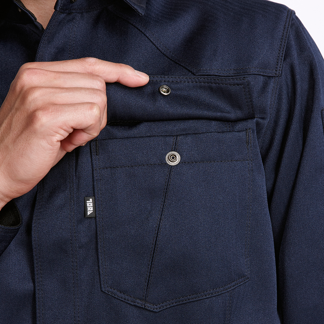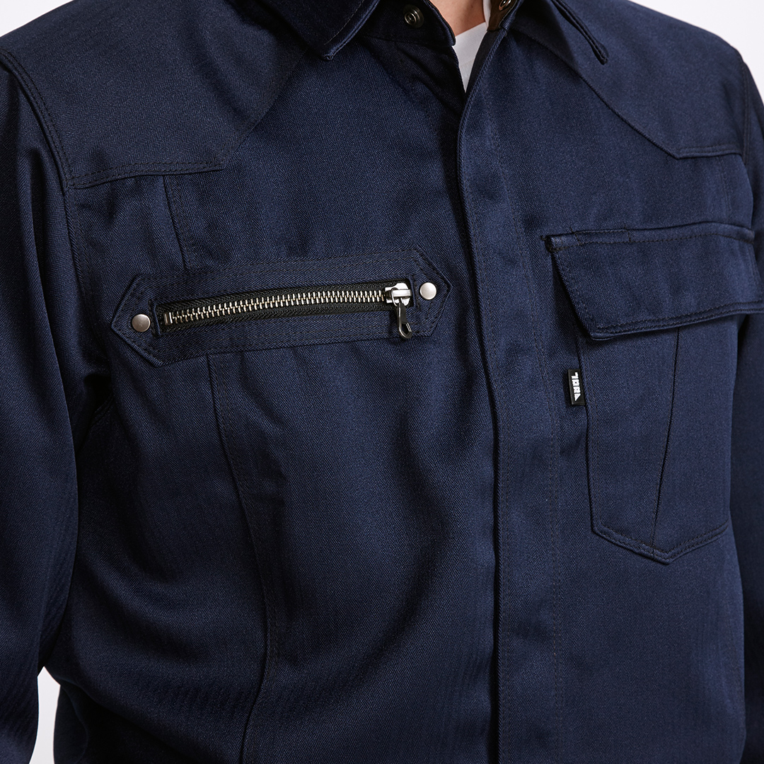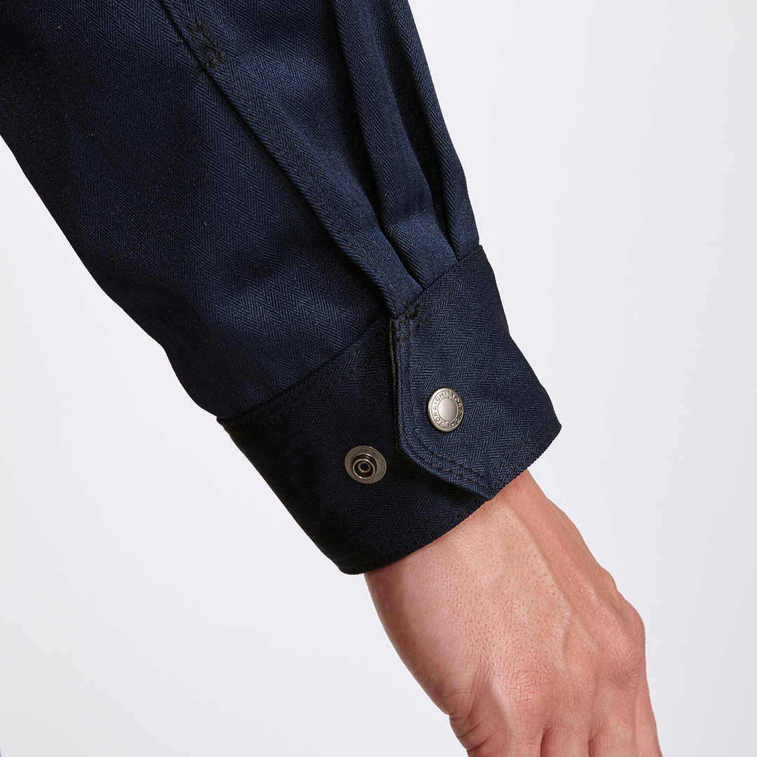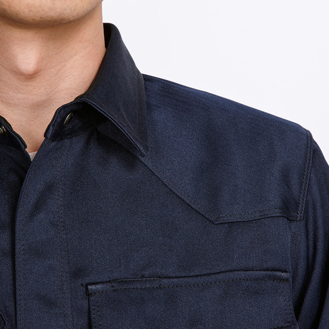 ミニヘリンボーンの素材感や衿裏・袖口裏の切替配色が、